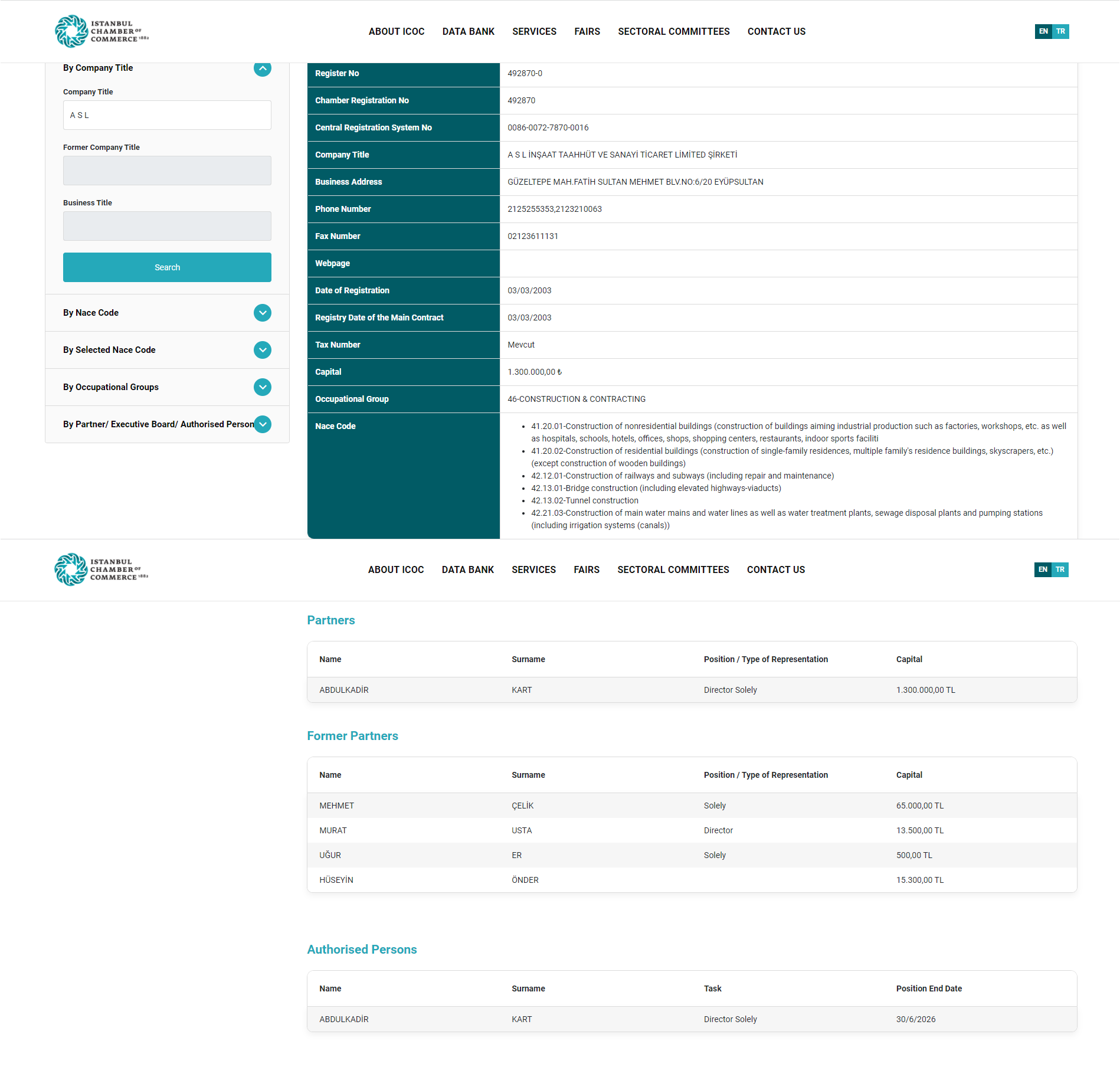 → Te dhenat e Dhomes se Tregtise Stamboll per shoqerine ASL INSAAT TAAHHUT VE SANAYI TICARET LIMITED SIRKETI, date 11.10.2021 → Te dhenat e Dhomes se Tregtise Stamboll per shoqerine ASL INSAAT TAAHHUT VE SANAYI TICARET LIMITED SIRKETI, date 15.08.2024 |