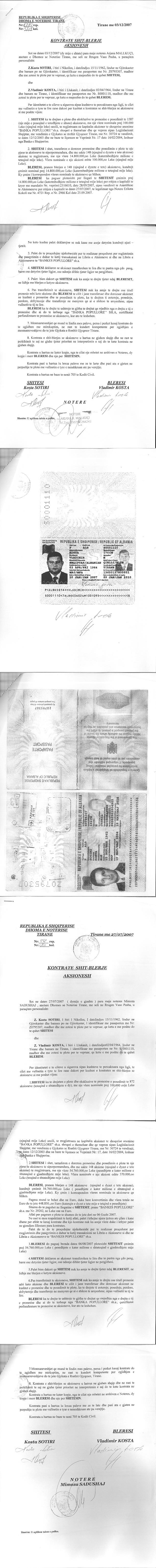 b. Transferimi i pronësisë së 398 aksioneve të zotëruara nga Znj. Greta Angjeli tek aksioneri i ri Z. Kosta Sotiri, nëpërmjet kontratës për blerje aksionesh Nr. 2589 Rep., Nr. 1464/1 Kol, datë 20.06.2006. Çmimi i shitjes ishte 1.060.000 (një milion e gjashtëdhjetë mijë) USD. Pas transferimit, aksioneri Kosta Sotiri do të zotërojë 2.84% të kapitalit të bankës.