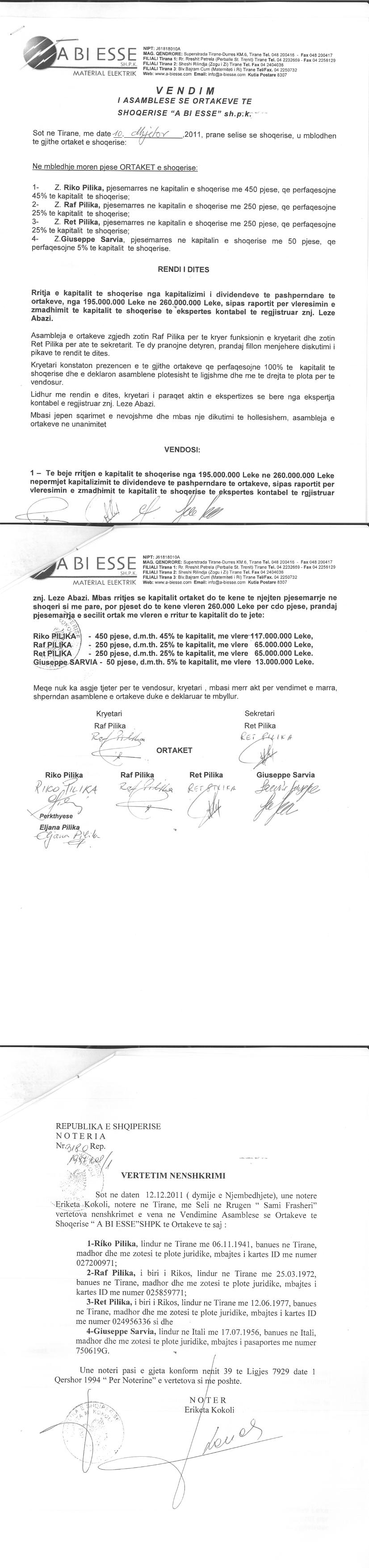 → Ekstrakt historik i regjistrit tregtar date 26.07.2021 → Statuti i shoqerise → Raporti per vleresimin e zmadhimit te kapitalit date 13.08.2010 → Kontrate shitje date 01.06.2001 → Kontrate shit-blerje date 25.10.2003 → Kontrate shitjeje date 01.06.2001 → Kontrate shit-blerje date 11.12.1999 → Kontrate shit-blerje ndermjet Giuseppe Sarvias dhe ortakeve Paolo Mellano dhe Raf Pilika → Kontrate shit-blerje ndermjet shitesit Luiggi Trigari dhe bleresve Aldo Boetti dhe Raf Pilika date → Kontrate shit-blerje ndermjet shitesit Roberto Dako dhe bleresve Giuseppe Sarvia, Luigi Trigari → Kontrate shit-blerje date 25.10.2003 → Kontrate dhurimi e kuotave date 30.03.2018 → Kontrate shit-blerje date 26.12.2008 → Kontrate shit-blerje date 29.07.2008 → Vendim i asamblese se ortakeve date 02.11.2020 → Vendim i asamblese se ortakeve per rritjen e kapitalit date 13.09.2009 → Vendim i asamblese se ortakeve per rritjen e kapitalit date 10.12.2011 → Vendim i asamblese se ortakeve per rritjen e kapitalit date 25.09.2008 → Vendim i asamblese se ortakeve per rritjen e kapitalit date 13.07.2016 → Ekstrakt Historik i Regjistrit Tregtar date 09.06.2023 |
