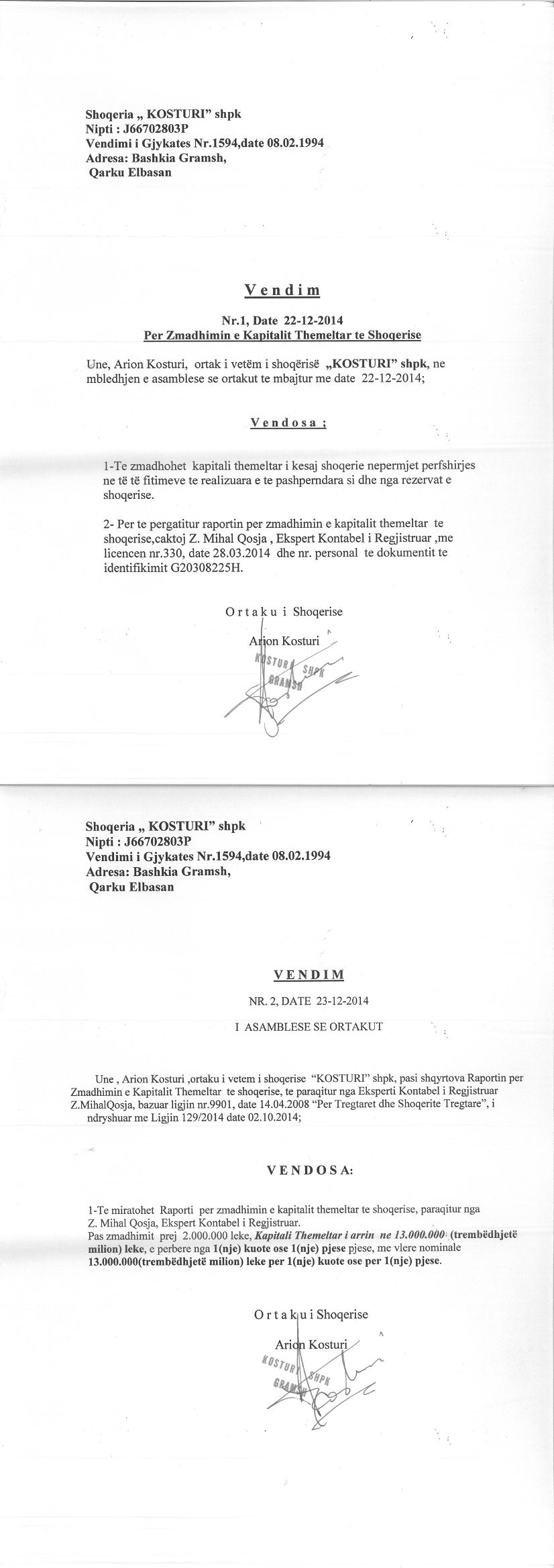 → Ekstrakti Historik I Regjistrit Tregtar date 04.08.2022 → Akt themelimi dhe Statuti i Shoqerise → Kontrate Dhurimi Kuotash date 11.12.2005 → Vendim i Ortakut te Vetem, Zmadhim Kapitali date 07.11.2009 → Vendim i Ortakut te Vetem, Zmadhim Kapitali date 23.12.2014 → Vendim i Ortakut te Vetem, Zmadhim Kapitali date 12.08.2016 |