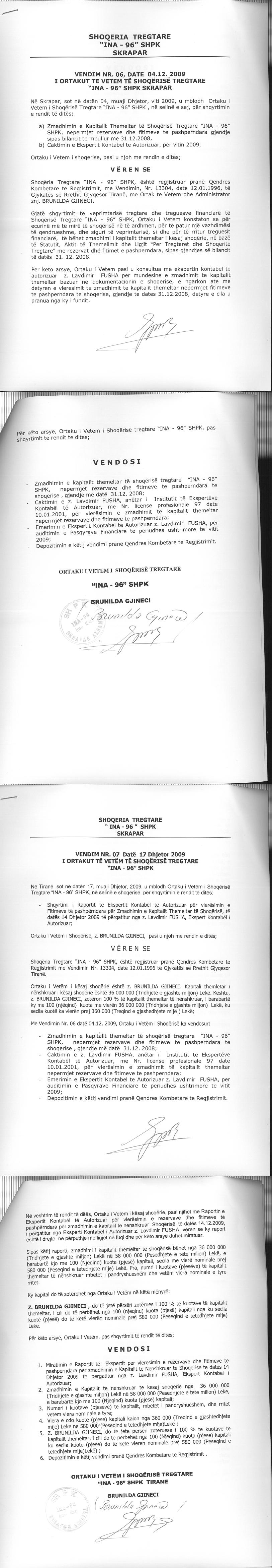 → Ekstrakt historik i regjistrit tregtar date 26.12.2025 → Akti i themelimit dhe statuti i shoqerise → Vendimi i asamblese se ortakeve per rritjen e kapitalit date 15.11.2006 → Vendim i asamblese se ortakeve per zmadhimin e kapitalit date 29.06.2008 → Vendim i asamblese se ortakeve per zmadhimin e kapitalit date 04.12.2009 → Urdher per vendosjen e sekuestros konservative date 11.03.2013 → Vendim i Gjykates se Rrethit Gjyqesor Tirane date 01.10.2013 → Urdher per vendosjen e sekuestros konservative date 29.03.2016 → Vendimi i asamblese se ortakeve per zvogelimin e kapitalit date 26.06.2020 |