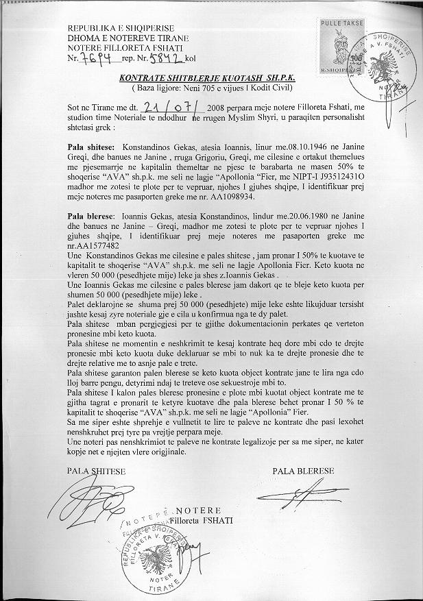 → Ekstrakt historik i regjistrit tregtar date 16.09.2021 → Akti i themelimit dhe statuti → Kontrate shitje kuotash date 01.06.2017 → Kontrate shitblerje kuotash date 21.07.2008 |