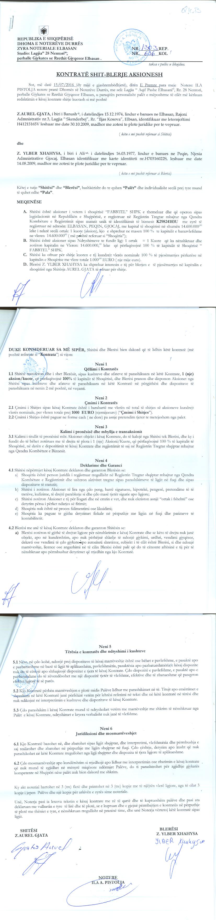 → Ekstrakti Historik i Regjistrit Tregtar date 14.01.2023 → Akt themelimi dhe Statuti i Shoqerise → Vendim i Ortakut te Vetem, Zmadhim Kapitali date 23.07.2010 → Kontrate Shitblerje Kuotash date 15.07.2016 → Deshmia e Trashegimise Ligjore date 17.06.2021 → Urdher per Venie Sekuestro date 06.07.2022 → Urdher per Heqje Sekuestro date 13.07.2022 → Kontrate shitje kuotash kapitali date 12/10/2022 |