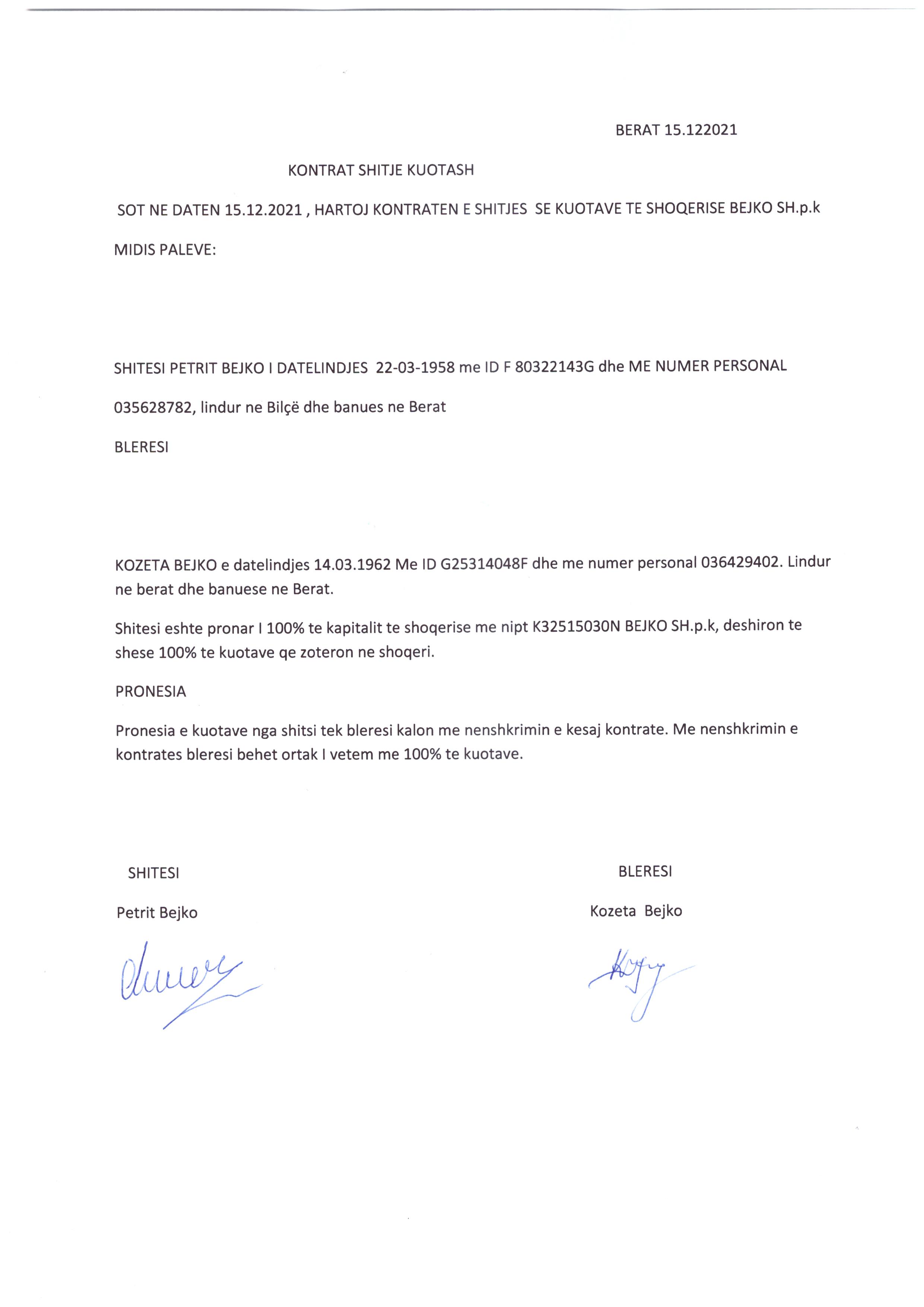 → Ekstrakti Historik i Regjistrit Tregtar date 23.02.2022 → Statuti i Shoqerise → Kontrate e Shitjes se Kuotave date 15.12.2021 |