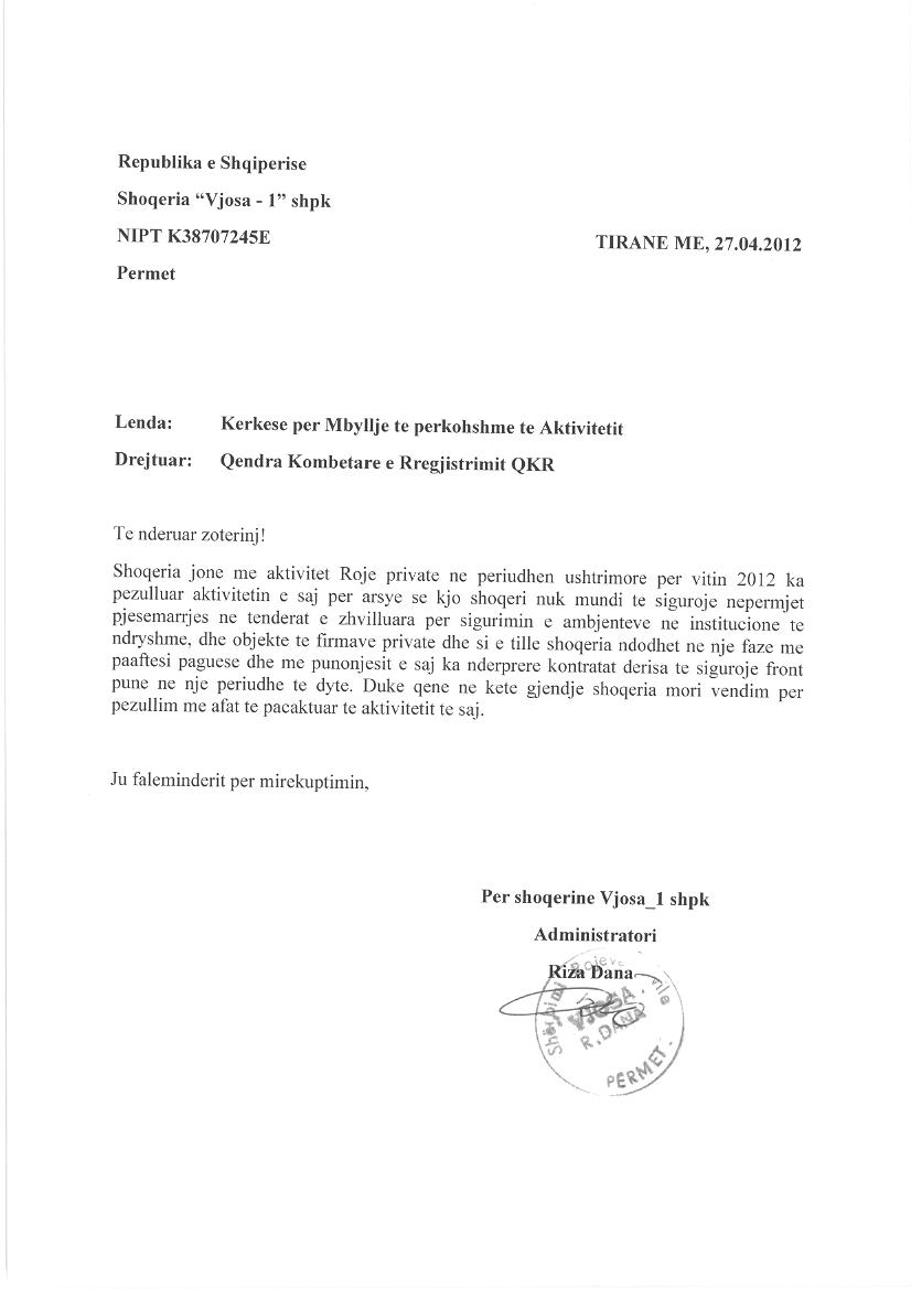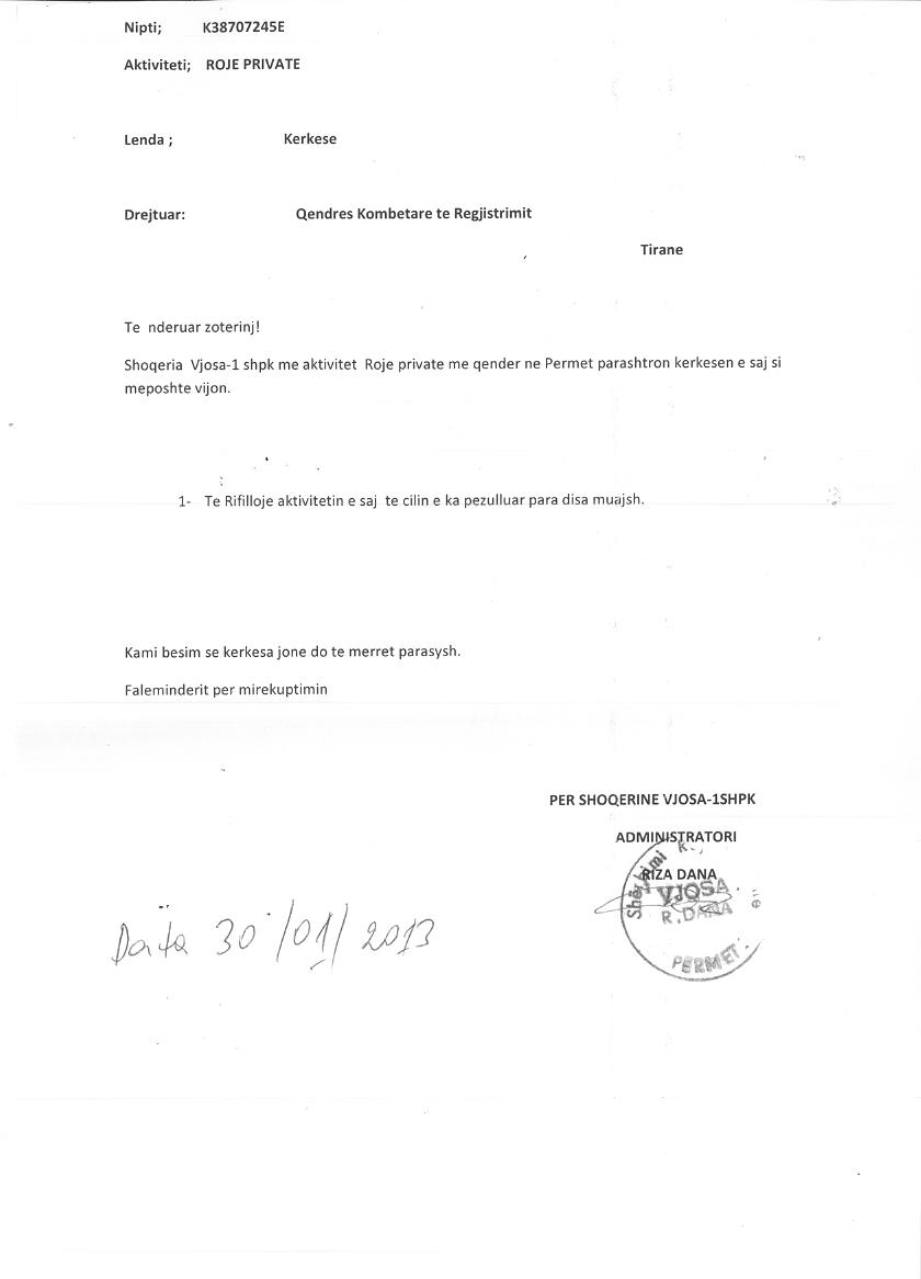 → Ekstrakt historik i regjistrit tregtar date 07.01.2022 → Akti i themelimit dhe statuti → Kontrate dhurimi kuotash date 09.04.2016 → Kerkese per rifllimin e aktivitetit date 30.01.2013 → Kerkese per mbylljen e perkohshme te aktivitetit, date 28.06.2013 → Kerkese per mbylljen e perkohshme te aktivitetit date 27.04.2012 |