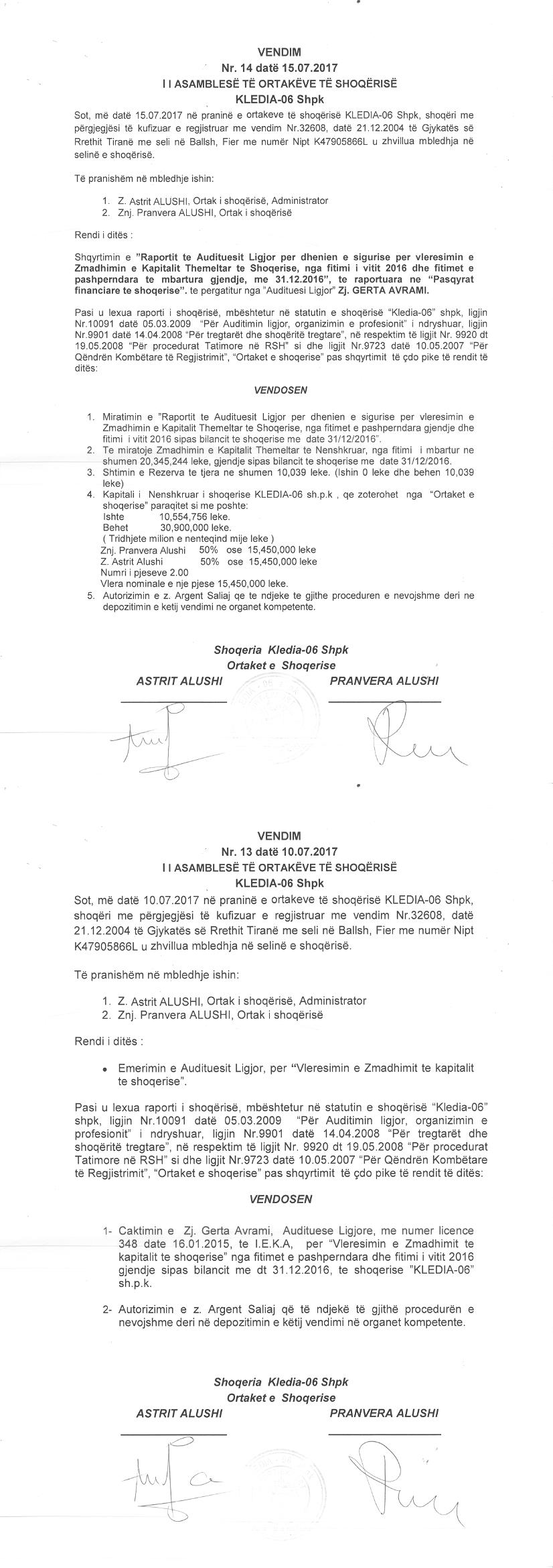 → Ekstrakt historik i regjistrit tregtar date 10.09.2021 → Akti i themelimit dhe statuti → Vendimi i asamblese se ortakeve per zmadhimin e kapitalit date 15.07.2017 → Ekstrakt historik i regjistrit tregtar date 20.09.2025 |