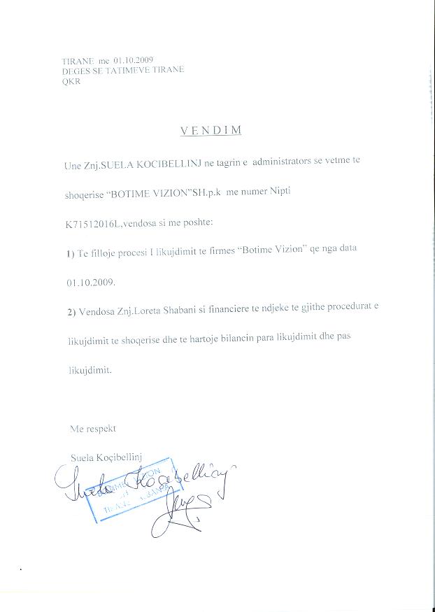 → Ekstrakt Historik i Regjistrit Tregtar date 11.11.2025 → Ekstrakt historik i regjistrit tregtar date 08.12.2025 → Kontrate shitblerje kuotash kapitalit date 31.01.2008 → Vendimi per fillimin e procesit te likujdimit te dates 01.10.2009 → Vendimi per miratimin e raportit te likujdimit te shoqerise date 20.04.2010 |