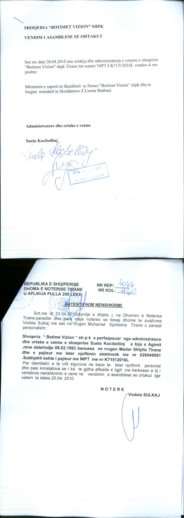 | Çështje Ligjore: | I. Me date 01.10.2009, u fillua procesi i likujdimit te shoqerise “Botime Vizion” dhe u vendos Znj. Loreta Shabani si financiere te ndjeke te gjithe procedurat e likujdimit te shoqerise. Statusi i shoqerise kaloi nga “Aktiv” ne “Shoqeri ne likuidim e siper”. II. Me date 20.04.2010, me vendim te ortakut te vetem, u miratua raporti i likujdimit te shoqerise “Botimet Vizion” shpk dhe u hoq mandati i likuidatores Z. Loreta Shabani. Statusi i shoqerise kaloi nga “Shoqeri ne Likuidim e Siper” ne “C’regjistruar”. |