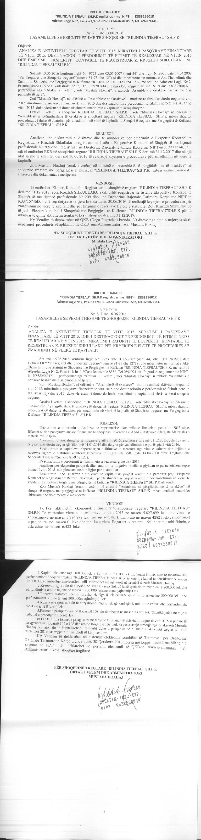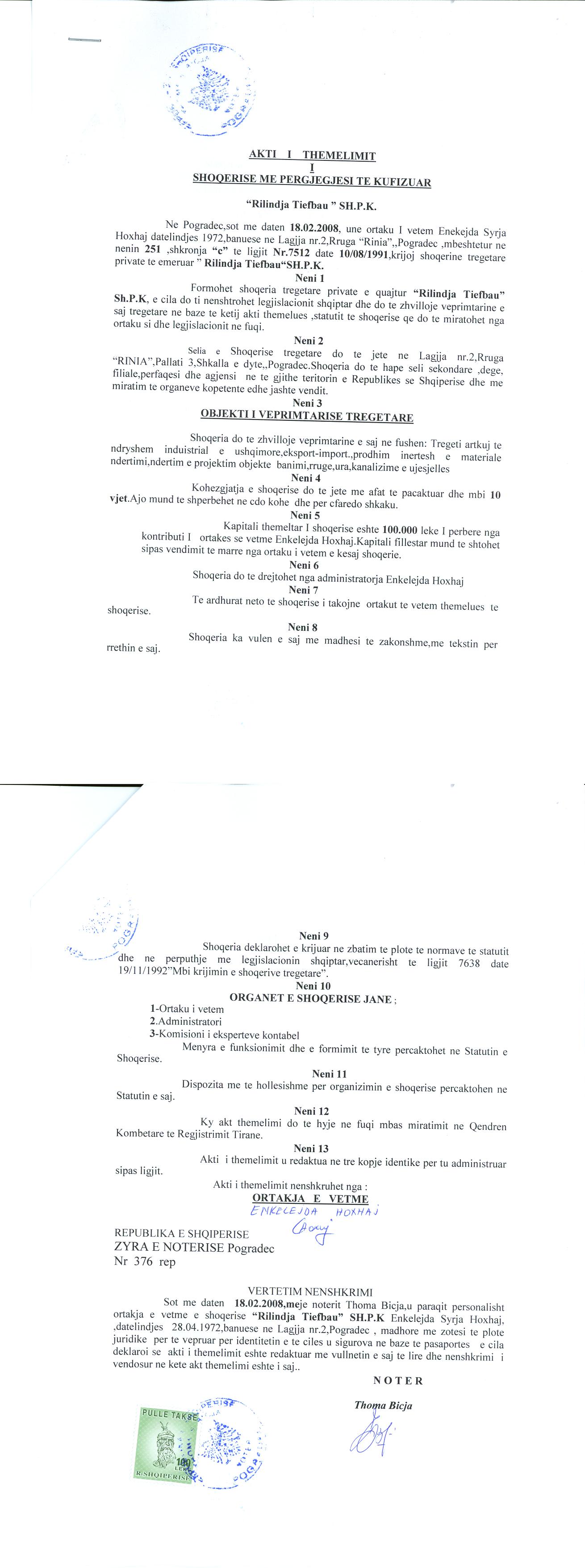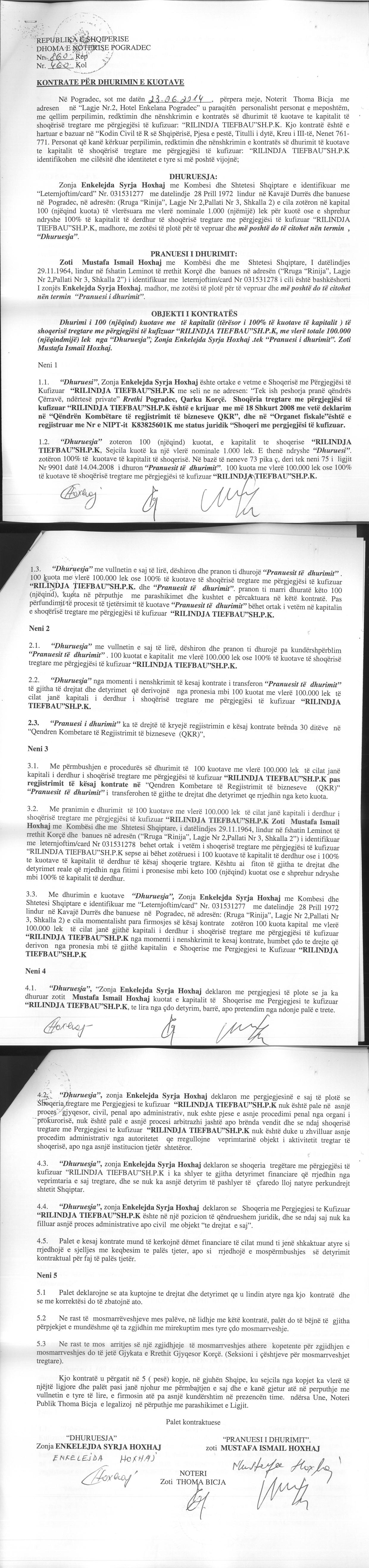→ Ekstrakti Historik i Regjistrit Tregtar date 07.06.2022 → Akti i themelimit te Shoqerise → Kontrate e Dhurimit te Kuotave date 23.06.2014 → Vendim i Asamblese se Pergjithshme per rritjen e kapitalit date 13.06.2016 |