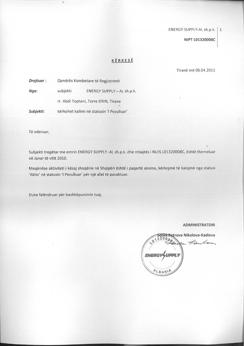 | Emërtime të tjera Tregtare: | ENERGY SUPPLY - AL |