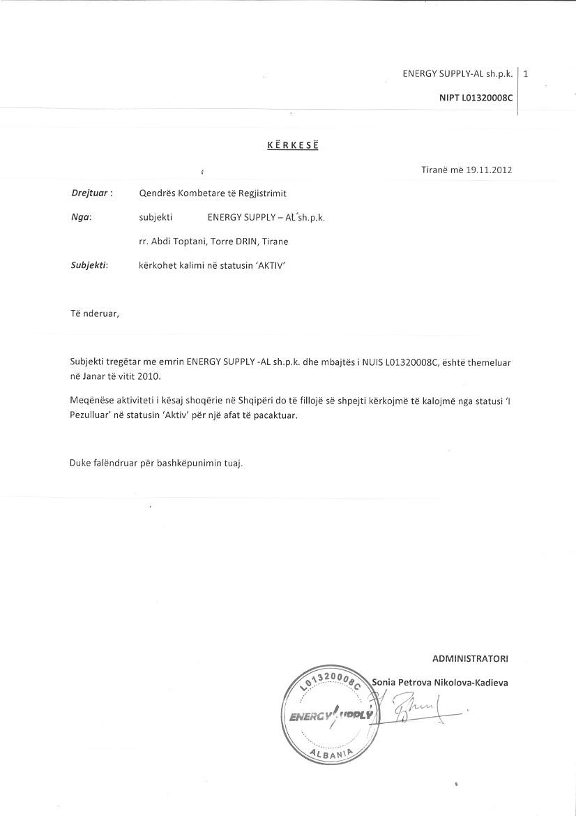 | Objekti i Veprimtarisë: | Tregtim i energjise elektrike dhe furnizim me energji elektrike te klienteve te kualifikuar. |