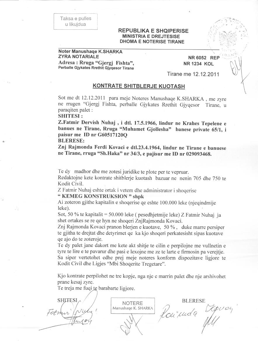 → Ekstrakt historik i regjistrit tregtar 01.03.2021 → Akti i themelimit → Kontrate shitblerje kuotash 29.05.2012 → Kontrate shitblerje kuotash 12.12.2011 → Ekstrakti Historik i Regjistrit Tregtar date 08.05.2023 |