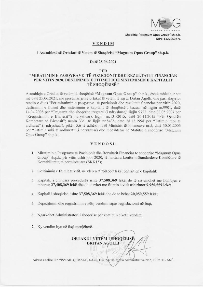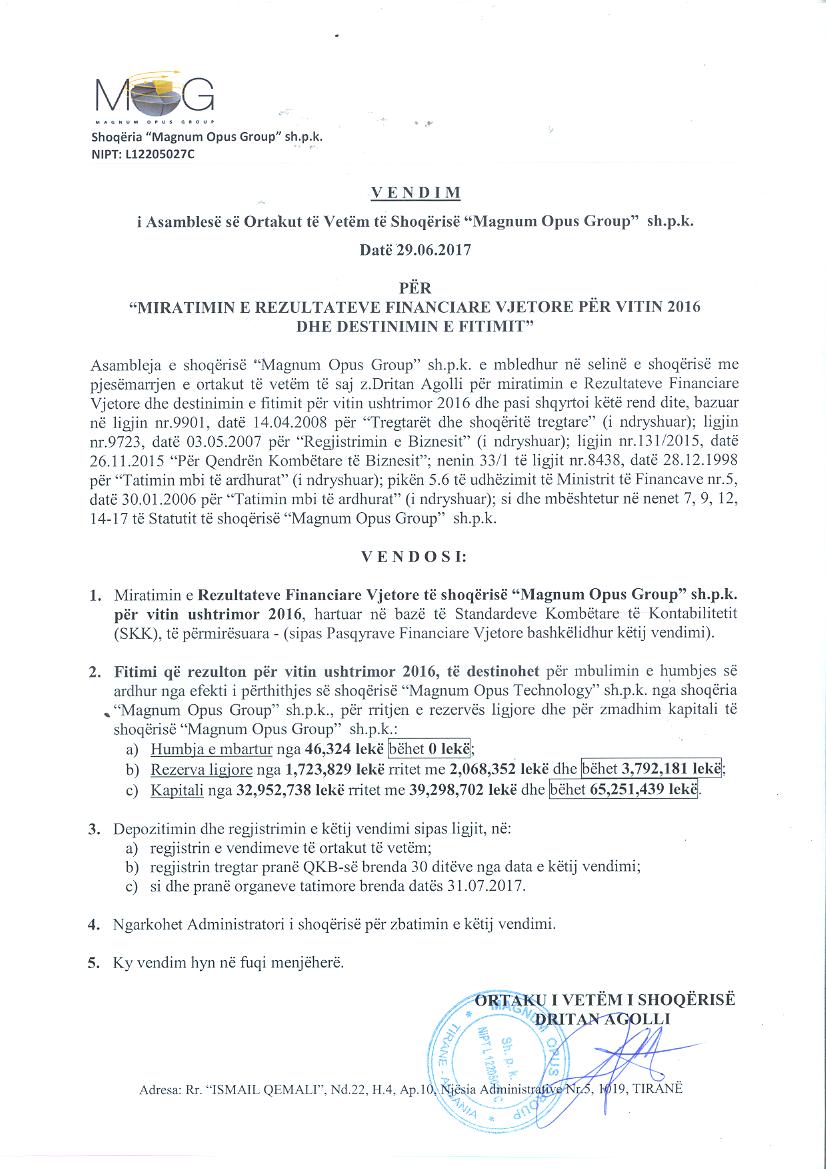 | Çështje Ligjore: | Me date 05.10.2016, eshte realizuar bashkimi me perthithje i shoqerive “Magnum Opus Technology” sh.p.k me shoqerine “Magnum Opus Group” sh.p.k ku shoqeria “Magnum Opus Group”sh.p.k do te jete shoqeri perthithese dhe shoqeria “magnum Opis Technology”sh.p.k do te jete shoqeri e perthithur. |