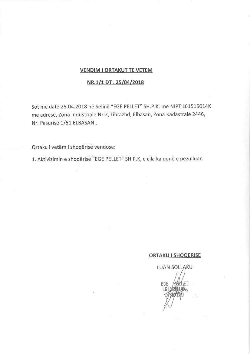 → Ekstrakt historik i regjistrit tregtar date 26.12.2025 → Statuti i shoqerise → Vendimi i asamblese dhe kontrata e shitblerjes se kuotave te kapitalit date 24.12.2018 → Kontrate shitje kuotash kapitali date 10.07.2025 → Vendimi i ortakut te vetem per aktivizimin e shoqerise date 24.04.2018 |