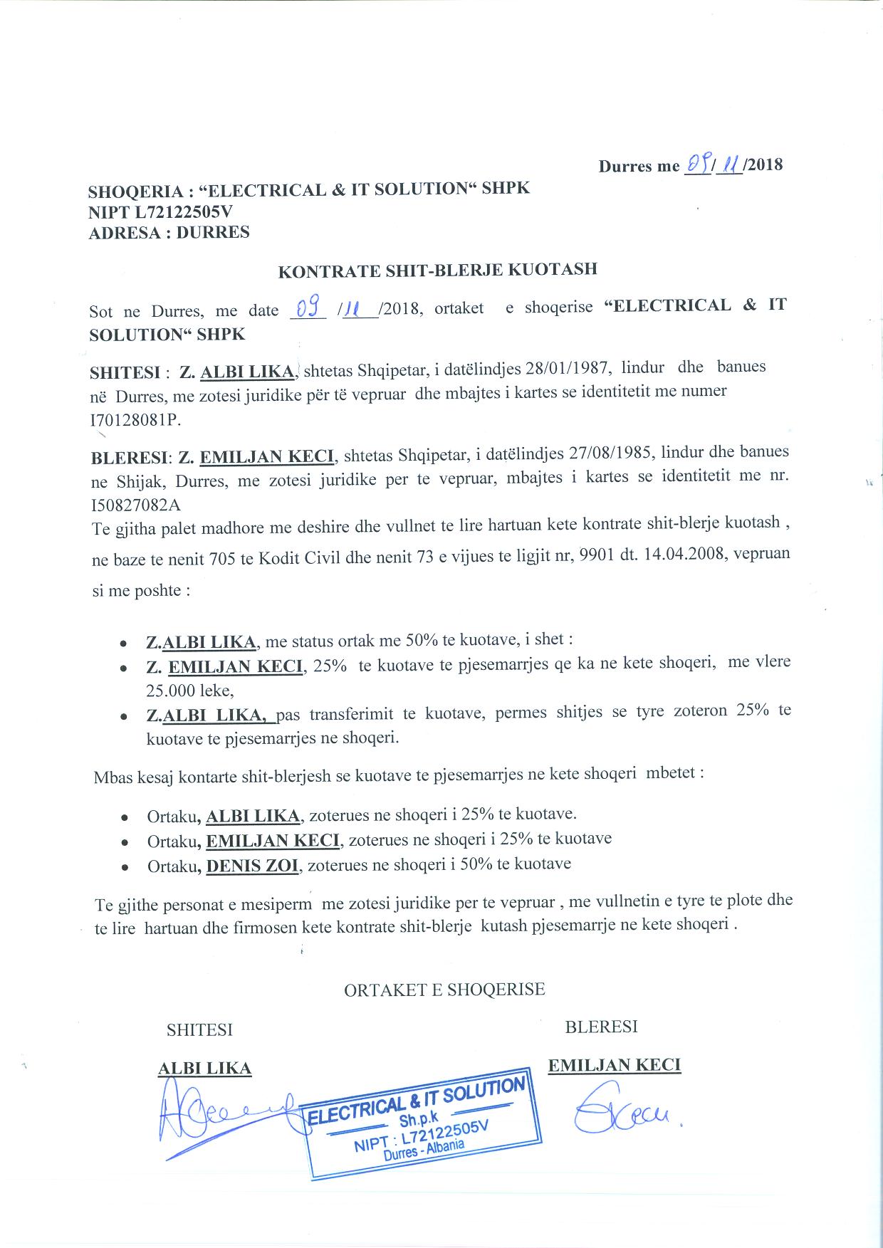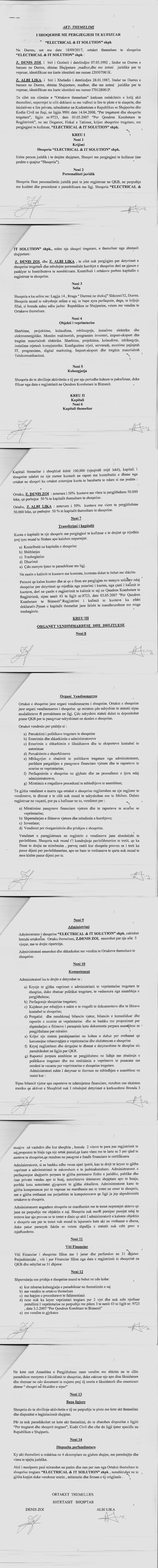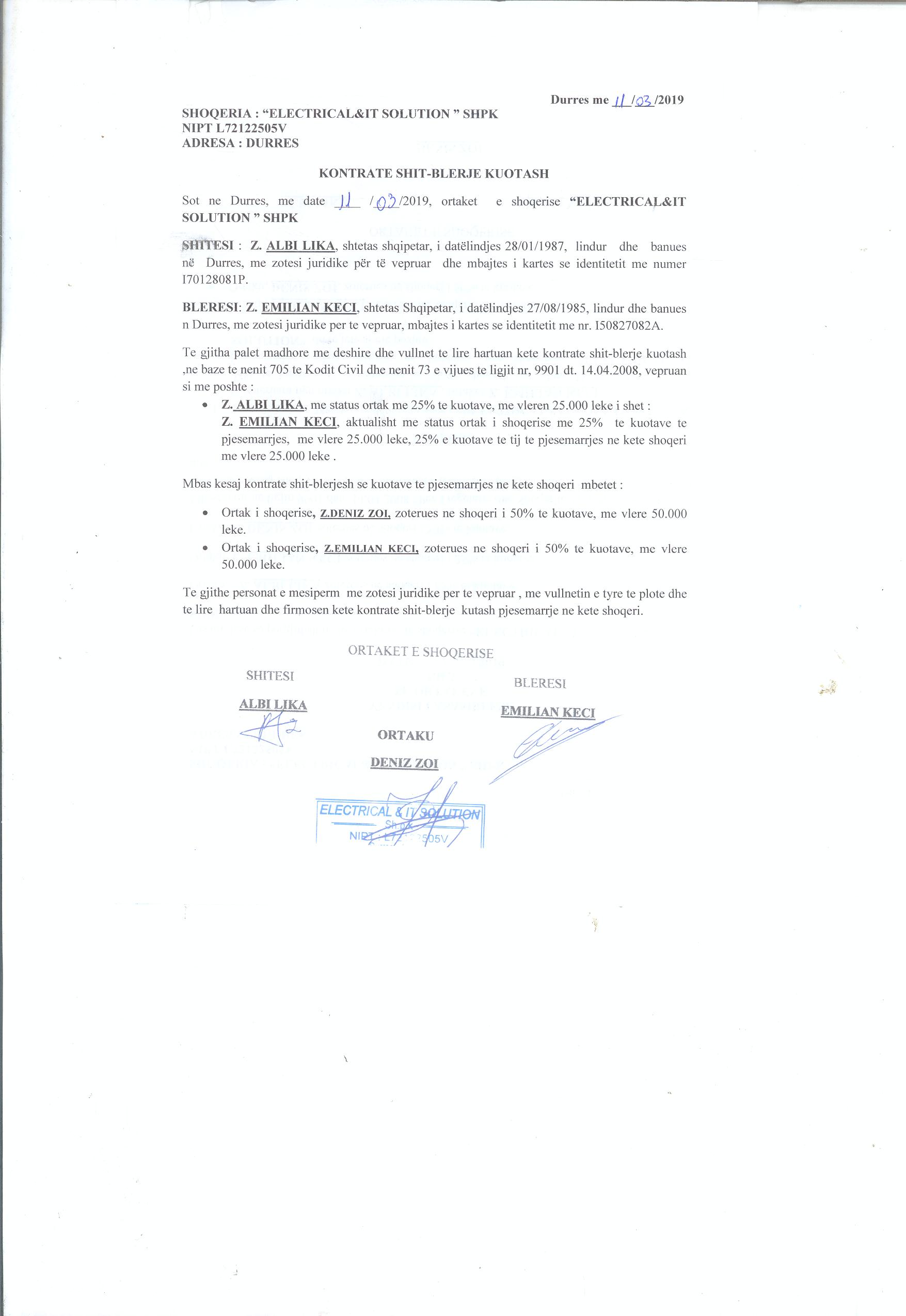 → Ekstrakti Historik i Regjistrit Tregtar date 26.01.2023 → Akt themelimi i Shoqerise → Kontrate Shitblerje Kuotash date 09.11.2018 → Kontrate Shitblerje Kuotash date 11.03.2019 → Kontrate Shitblerje Kuotash date 26.12.2019 → Kontrate Shitblerje Kuotash date 20.05.2021 → Kontrate Shitblerje Kuotash date 09.09.2021 |