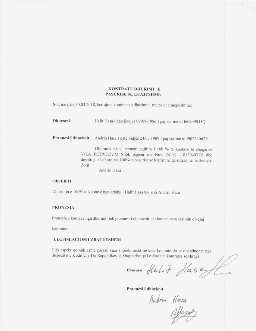 → Ekstrakti Historik I Regjistrit Tregtar date 03.09.2020 → Kontrate e Dhurimit te Kuotave date 30.03.2018 |