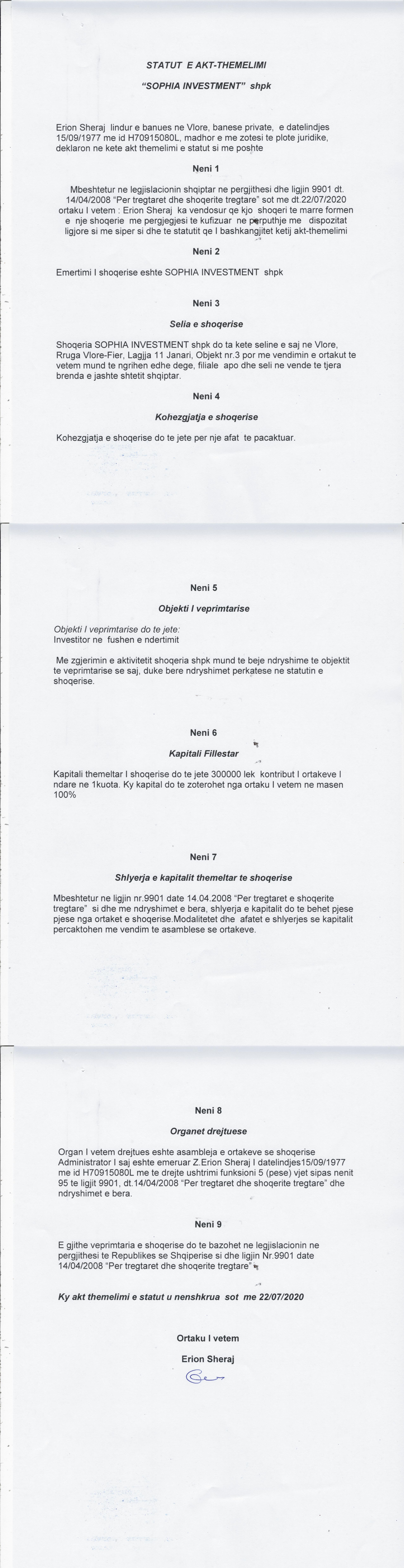 | Emërtime të tjera Tregtare: | SOPHIA INVESTMENT |