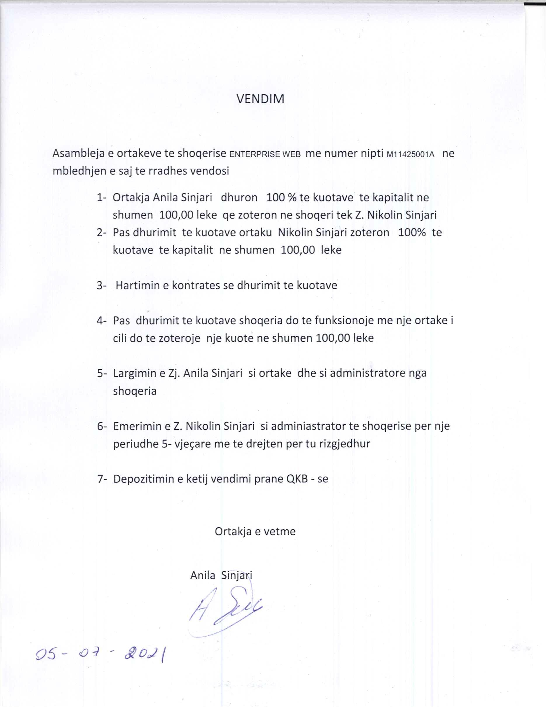 → Ekstrakt Historik i Regjistrit Tregtar, date 7.10.2021 → Statuti i shoqerise, date 23.02.2021 → Kontrata e dhurimit te kuotave, date 05.07.2021 → Vendimi i ortakut te vetem , date 05.07.2021 |