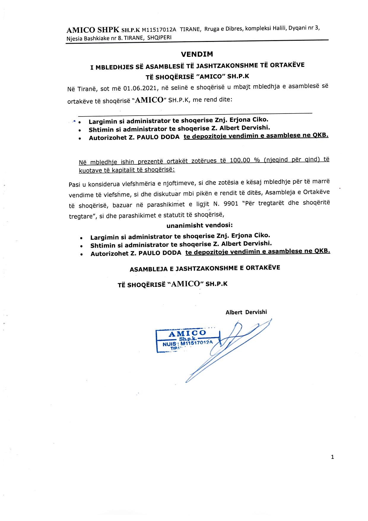 → Ekstrakt Historik i Regjistrit Tregtar, date 21.10.2021 → Akt themelimi, date 12.03.2021 → Statuti i shoqerise,date 12.03.2021 → Kontrate e Dhurimit te Kuotave,date 26.05.2021 → Vendimi i Asamblese se Ortakeve , date 01.06.2021 |