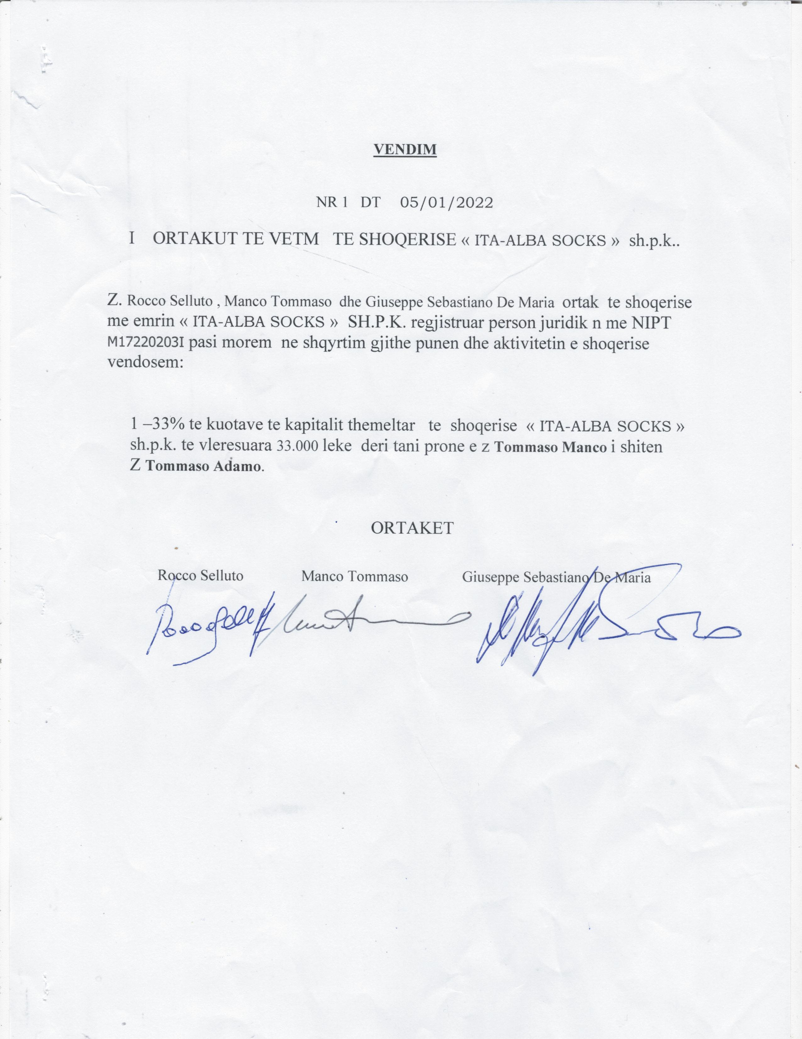 → Ekstrakti Historik i Regjistrit Tregtar date 07.03.2022 → Akt themelimi dhe Statuti i Shoqerise → Vendimi i asamblese se pergjithshme date 05.01.2022 → Kontrate shitje kuotash kapitali date 05.01.2022 |