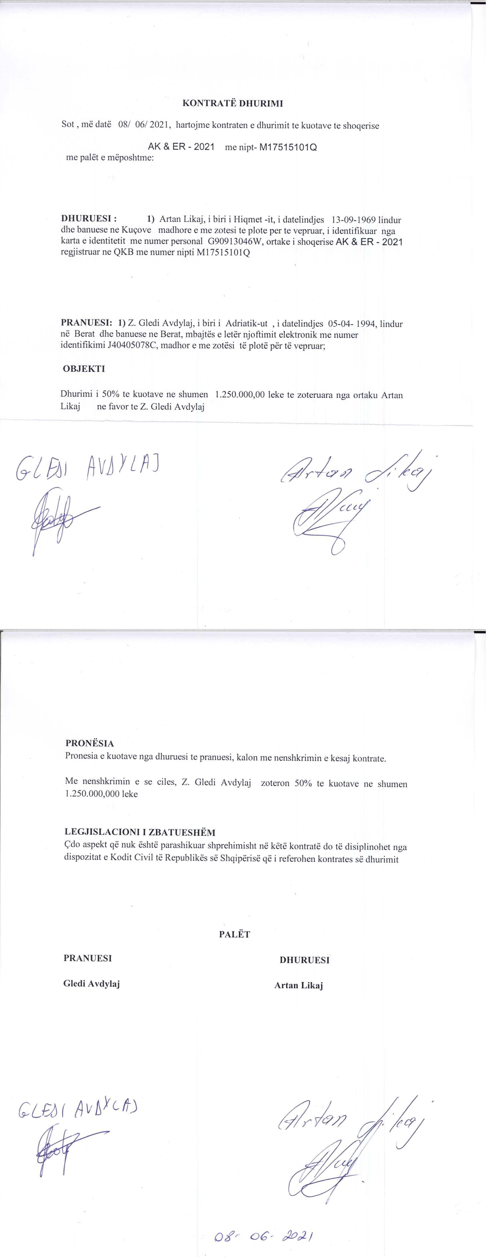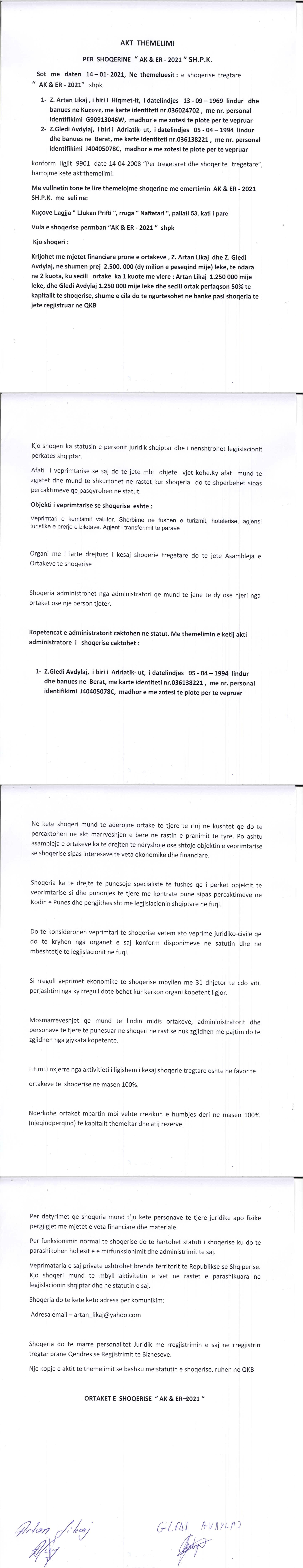 → Ekstrakt Historik i Regjistrit Tregtar, date 3/9/2021 → Kontrate e dhurimit te kuotave, date 8/6/2021 → Akti i themelimit, date 14/1/2021 |