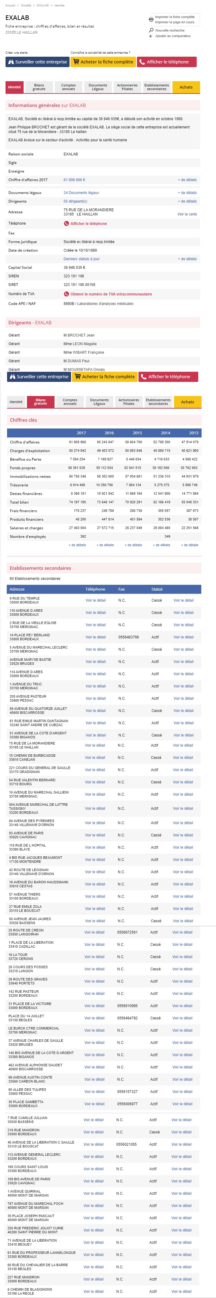 | Additions: | Të dhënat e publikuara për këtë kompani nuk janë zyrtare. Informacioni për këtë kompani është marrë në faqen https://www.verif.com/etablissements-secondaires/EXALAB-323191106/. Fitues të konçesionit për shërbimin laboratorik të spitaleve universitare, rajonale, dhe atyre bashkiake të Sarandës e Lushnjës Më datë 22.12.2016 është bërë shpallja e njoftimit të konçesionit për ofrimin e shërbimit laboratorik të spitaleve universitare, rajonale, dhe atyre bashkiake të Sarandës e Lushnjës. Më datë 15.02.2017 u mbajt proçedura konkurruese e konçesionit, në të cilën kanë qenë pjesëmarrës këta operatorë ekonomikë me ofertat përkatëse: a) Acibadem Saglik Hizmetleri ve Ticaret A.S (%51) & Acibadem Labmed Saglik Hizmetleri A.S (%49) ; (Turqi), Vlera 4.80 % zbritje nga çmimi i listës së testeve. b) American Hospital Sh.a (AL), Vlera nuk u paraqit. c) Biometric Albania Sh.p.k (AL), Vlera nuk u paraqit. d) Montal Sh.p.k (AL), Vlera nuk u paraqit. e) Genius Sh.p.k (AL), Vlera 15 % zbritje nga çmimi i listës së testeve. f) Intermedica Center Sh.p.k (AL) (%66) dhe Bioiatriki (Biomedicine) Sh.a (%34) Greqi, Vlera 5.70 % zbritje nga çmimi i listës së testeve. g) Labopharma Sh.p.k (AL) (%41.7) & Exalab France (%25) & AB Laboratory Solutions B.V (%33.3) Hollandë , Vlera 10.70 % zbritje nga çmimi i listës së testeve. h) Fedos Sh.p.k (AL), Vlera nuk u paraqit. 9. Krijon Sh.p.k (AL), Vlera nuk u paraqit. Më datë 24.04.2017, me anë të njoftimit të Ministrisë së Shëndetësisë, konsorciumi BOE Labopharma Sh.p.k & Exalab Francë & AB Laboratory Solutions B.V Hollandë, me përfaqësues Labopharma Sh.p.k, u shpall fitues i konçesionit për ofrimin e shërbimit laboratorik të spitaleve universitare, rajonale dhe atyre bashkiake të Sarandës dhe Lushnjës. * Kapitali i shoqërisë është 38946035 euro dhe është konvertuar në lekë me kursin e këmbimit të datës 14.10.2020. |