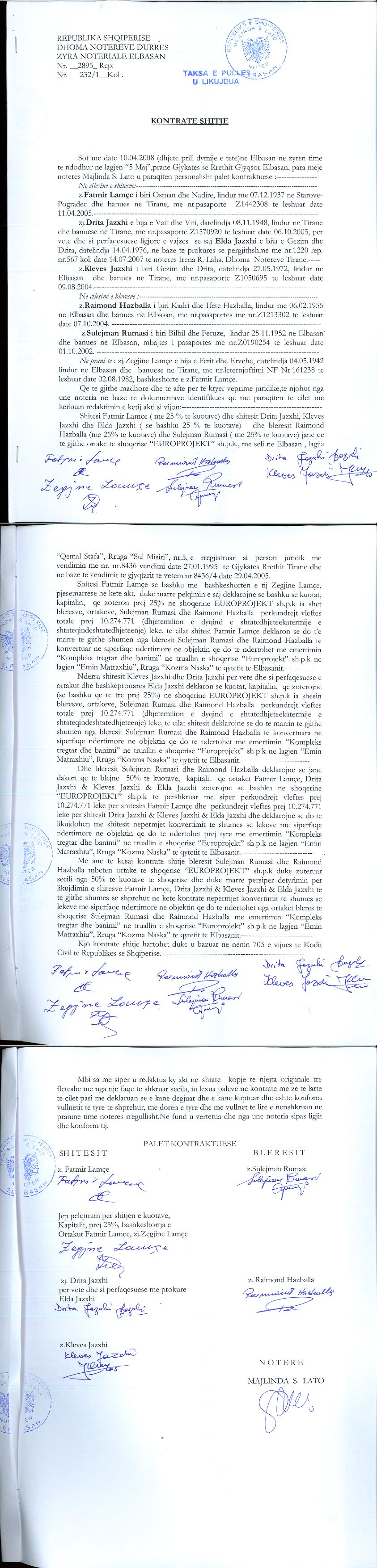 → Ekstrakti Historik i Regjistrit Tregtar date 12.05.2022 → Akt themelimi dhe Statuti i Shoqerise → Deshmi trashegimie date 21.10.2004 → Vendim i Gjyqtarit te Vetem per Zmadhim Kapitali date 27.12.2005 → Kontrate e Shitjes se Kuotave date 10.04.2008 → Kontrate e Dhurimit te Kuotave date 28.01.2020 → Ekstrakti Historik i Regjistrit Tregtar date 19.04.2024 |