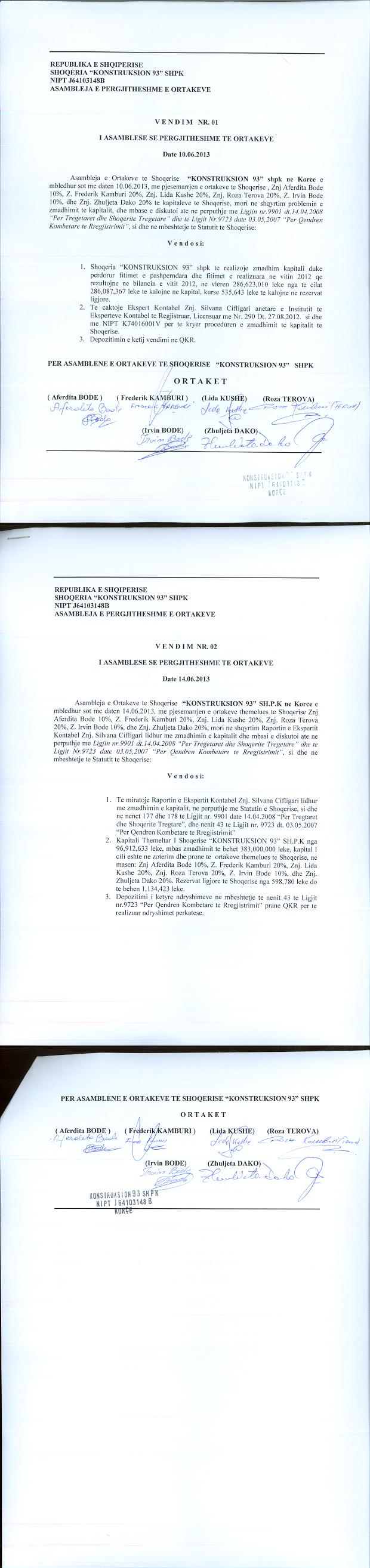 | Legal Cases: | I. Me date 17.02.2014, me ane te Urdhrit Nr.251 Prot., Nr.125 Dosje, lëshuar nga shoqëria përmbarimore "VAKO & PARTNERS BAILIFF SERVICE"sh.p.k, u urdherua vendosja e masës së sekuestros konservative mbi aksionet e zotëruara nga debitori: shoqëria “KONSTRUKSION 93”sh.p.k., me NUIS(NIPT) J64103148B. II. Me date 28.03.2014, me ane te vendimit Nr.207 Regj.Themeltar, Nr.142 Vendimi, te Gjykates Administrative te Shkalles se Pare Korçe, u pranua padia per konstatimin absolutisht te pavlefshem te aktit administrativ vendimit, date 20.09.2012 ‘Per denim me gjobe” I leshuar nga Inspektoriati Ndertimor Urbanistik Kombetar. III. Me date 03.07.2014, me ane te urdhrit Nr. 1140 Prot., Nr. 125 Dosje, lëshuar nga Shoqëria Përmbarimore “Vako & Partners Bailiff Service“ sh.p.k, u urdherua bllokimi i aksioneve apo kredive të shoqërisë “Konstruksion 93” sh.p.k me NUIS (NIPT) J64103148B, të bllokuara me anë të shkresës Nr.251 Prot, datë 17.02.2014. IV. Me date 13.11.2018, me ane te Urdhrit Nr.1221 Prot. Nr.1161 Dosje "Për Vënien e Sekuestros Konservative”, protokolluar nga QKB me Nr.12931 dt. 14.11.2018, lëshuar nga Permbaruesi Gjyqesor Altin Vako, u urdherua vendosja e masës së sekuestros konservative mbi te gjitha aksionet e debitorit shoqeria “KONSTRUKSION 93” shpk, me NIPT J64103148B dhe Znj. Lida Qiraxhi. V. Me date 16.11.2018, me ane te Urdhrit nr. 1287 Prot, nr. 1161 Dosje datë, lëshuar nga Përmbaruesi Gjyqësor Privat Altin Vako, protokolluar nga QKB me nr. 13224 Prot., date 20.11.2018, u urdherua zhbllokimi i aksioneve te shoqërisë “KONSTRUKSION 93” shpk me NIPT J64103148B dhe Znj. Lida Selajdin Qiraxhi edtl 02.12.1955 të bllokuara me anë të shkresës Nr.1221 Prot. Nr.1161 Dosje, datë 13.11.2018 |