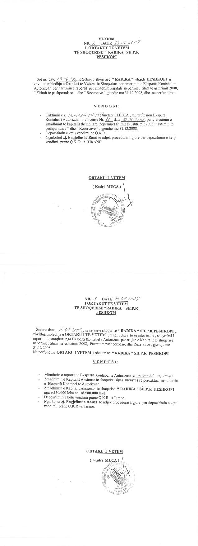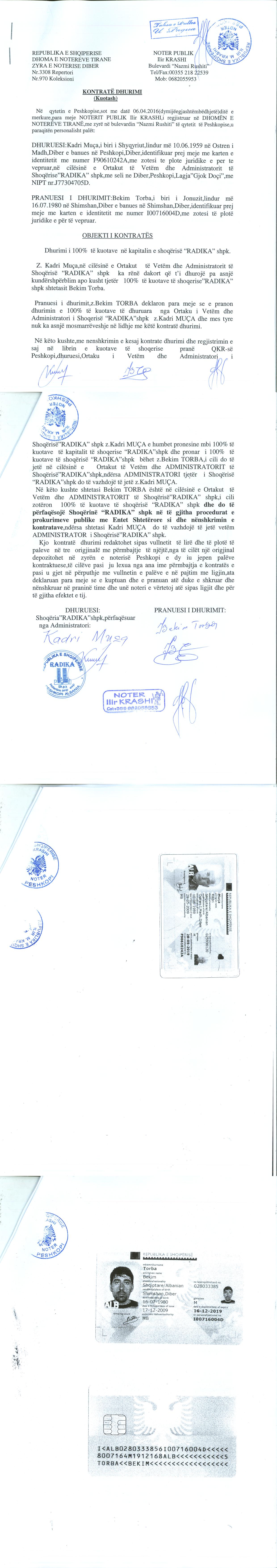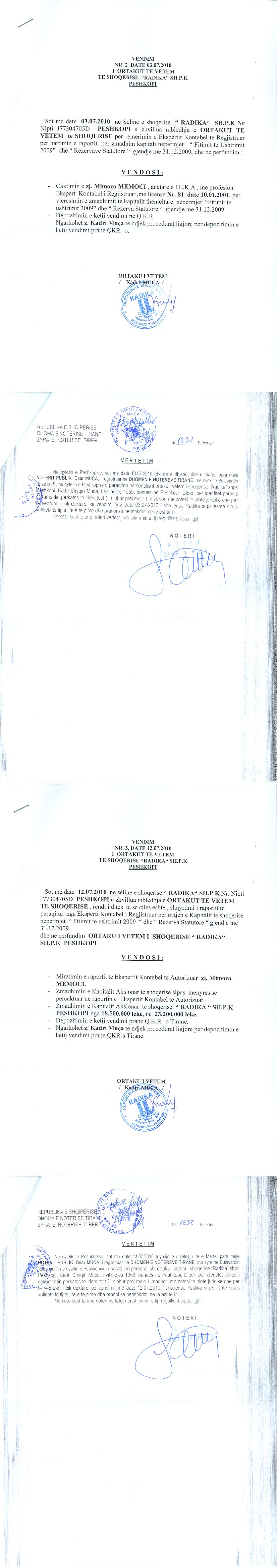| Legal Cases: | I. Me date 02.11.2020, me ane te urdhërit Nr.9731 Prot, lëshuar nga Shoqëria Përmbarimore “CORRECTOR” shpk , u urdherua vendosja e masës së sekuestros në aktivet/kuotat e subjektit “RADIKA “ sh.p.k, me Nuis (Nipt) J77304705D, duke ndaluar disponimin ose tjetersimin e tyre, si dhe te drejtat qe rrjedhin nga keto kuota. II. Me date 16.12.2020, me ane te Urdhërit Nr.11090 Prot, Nr. 1465 Dosje, protokolluar nga QKB me Nr. 11548 Prot., datë 21.12.2020, lëshuar nga Shoqëria Përmbarimore “CORRECTOR” sh.p.k, u urdherua heqja e masës së sekuestros konservative mbi subjektin “RADIKA” sh.p.k., pajisur me NUIS (Nipt)-J77304705D. |