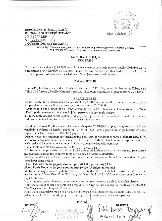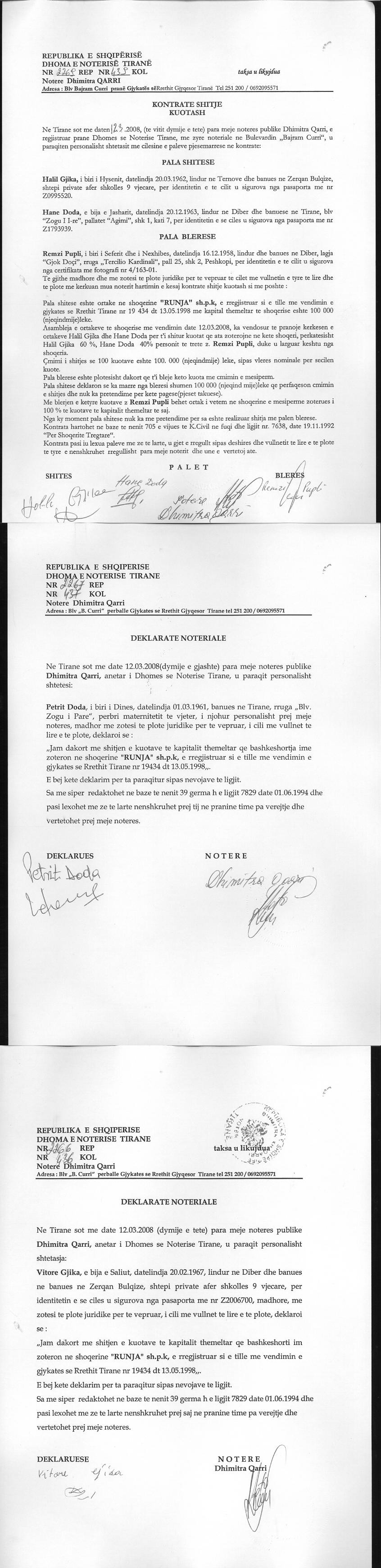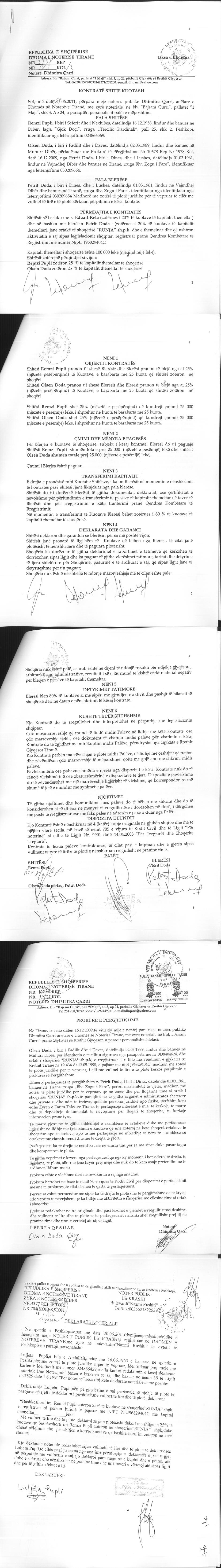 → Ekstrakt historik i regjistrit tregtar date 30.03.2022 → Akti i themelimit dhe statuti → Vendimi i asamblese se ortakeve per zmadhimin e kapitalit date 05.04.2012 → Kontrate shitje kuotash date 21.12.2004 → Kontrate shitje kuotash date 08.04.2009 → Kontrate shitje kuotash date 28.06.2011 → Kontrate shitje kuotash date 12.03.2008 → Kontrate shitje kuotash date 03.12.2009 → Kontrate dhurimi pjesesh date 26.10.2012 → Ekstrakti Historik i Regjistrit Tregtar date 18.04.2024 → Kerkese per vendosjen e mases se sigurimit te detyrimit tatimor date 27.07.2023 |