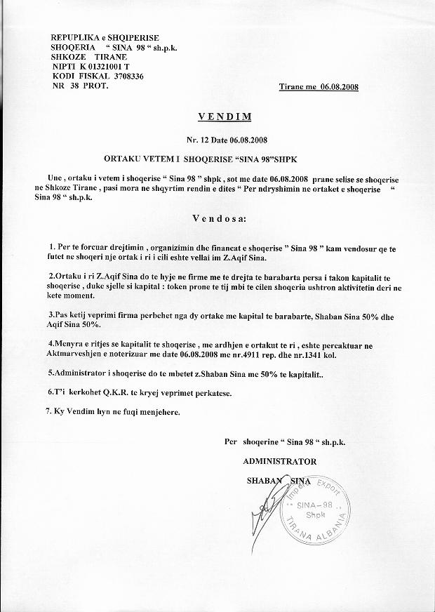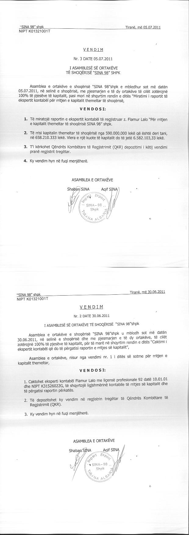 Me date 20.11.2001, me vendim te ortakut te vetem, u miratua fillimi i procedures se bashkimit pa likuidim, me perthithje ndermjet dy shoqerive “Sina-98” shpk dhe “Kalterisa” shpk. Ortaket te shoqerise se krijuar jane Shaban Sina dhe Rakip Sina. Emri i shoqerise se krijuar do te jete “Sina-98”. Te drejtat dhe detyrimet e shoqerise “Kalterisa” shpk do t’i kalojne shoqerise “Sina” sh.p.k. Kapitali themeltar i shoqerise pas perthithjes do te jete 200.000 leke si rrjedhoje e bashkimit te dy kapitaleve te shoqerive nga 100.000 leke. Dy ortaket zoterojne nga 50% te kapitalit secili. Administratoret e shoqerise do te jene z. Shaban Sina dhe z. Rakip Sina. II. Me date 27.08.2012, me ane te urdhrit Nr.11598 Prot, Nr.789,794,790,799 Dosje "Per vendosjen e Sekuestros mbi kuotat e debitorit", e leshuar nga Shoqeria Permbaruese Private “E.P.S.A” shpk drejtuar QKR, u urdherua vendosja e sekuestros mbi kuotat e debitorit Shoqeria “Sina 98” shpk NIPT K01321001T, perfaqesues Shaban Sina, si dhe mbi te drejtat qe rrjedhin nga zoterimi i ketyre kuotave duke ndaluar tjetersimin ose disponimin e tyre si dhe ushtrimin e te drejtave qe rrjedhin nga keto kuota. III. Me date 27.09.2012, me ane te Urdhrit Nr.12929 Prot., Nr.Dosje 833-836-834, lëshuar nga Shoqëria Përmbaruese Private “E.P.S.A” sh.p.k, u urdherua vendosja e sekuestros mbi kuotat e debitorit: “SINA 98” sh.p.k., me NIPTK01321001T, me përfaqësues Shaban Sina, si dhe mbi të drejtat që rrjedhin nga zotërimi i këtyre kuotave duke ndaluar tjetërsimin ose disponimin e tyre, si dhe ushtrimin e të drejtave që rrjedhin nga këto kuota. IV. Me date 22.10.2012, me ane te urdhrit Nr. 13818 Prot, leshuar nga shoqeria permbaruese private "E.P.S.A" sh.p.k, u hoq sekuestro mbi kuotat e debitorit "Sina 98" sh.p.k me NUIS (NIPT) - K01321001T e kerkuar nga ana jone me shkresen Nr. 12929 Prot. date 27.09.2012. V.Me date 11.03.2013, me ane te urdhrit Nr. 2765 Prot, leshuar nga shoqeria permbaruese private "E.P.S.A" sh.p.k, u hoq sekuestro mbi kuotat e debitorit "Sina 98" sh.p.k me NUIS (NIPT) - K01321001T e kerkuar nga ana jone me shkresen Nr. 11598 Prot. date 27.08.2012. VI. Me date 12.09.2013, me ane te urdherave Nr.3887 Prot., Nr.Dosje 660, dhe Nr.3890 Prot., Nr.Dosje 659, date 12.09.2013, lëshuar nga Shoqëria Përmbaruese Private “TRIS” sh.p.k, u urdherua vendosja e sekuestros mbi kuotat e debitorit shoqeria “Sina 98” sh.p.k me me perfaqesues ligjor Aqif Sina pajisur me NUIS (NIPT)- K01321001T; vendosja e sekuestros mbi kuotat e debitorit Shaban Maliq Sina dhe vendosja e sekuestros mbi kuotat e debitorit Aqif Maliq Sina si dhe mbi te drejtat qe rrjedhin nga zoterimi i ketyre kuotave duke ndaluar tjetersimin ose disponimin e tyre si dhe ushtrimin e te drejtave qe rrjedhin nga keto kuota. VII. Me date 03.04.2014, u nenshkrua Marreveshja e Pengut mbi kuota date Nr.599 Rep., Nr.223 Kol., e lidhur midis shoqerise SINA 98 sh.p.k (Kolateraldhenes) dhe Bankes Kombetare Tregtare (Kredidhenes) me objekt vendosjen e pengut ne favor te kolateralmarresit te gjitha kuotat qe perfaqesojne 55 % te kapitalit te shoqerise GAMA ENERGY sh.p.k te zoteruara nga ortaku, shoqeria SINA 98 sh.p.k. VIII. Me date 22.07.2015, me ane te urdhrit Nr. 871 Prot, leshuar nga shoqeria permbarimore private "TRIS" sh.p.k, u hoq bllokimi i kuotave dhe i te drejtave qe rrjedhin nga zoterimi i kuotave, urdheruar me shkresen Nr. 3887 Prot. date 12.09.2013 dhe 3890 Prot. date 12.09.2013 te shoqerise permbarimore private "TRIS" sh.p.k, per debitoret: Shoqeria "Sina 98" sh.p.k, me NUIS (NIPT) K01321001T, Shaban Sina, Aqif Sina. |
