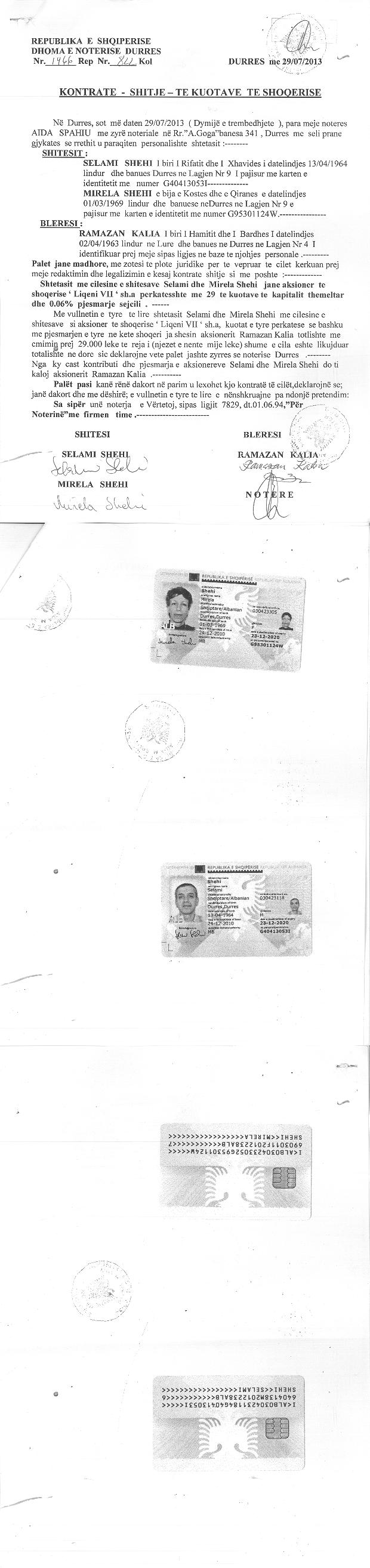 | Legal Cases: | I. Me date 10.11.2004, me vendim te aksionereve te shoqerise, u miratua propozimi per marrjen e kredise deri ne shumen prej 28.600.000 (njezet e tete milion e gjashteqind mije) leke. II. Me date 19.12.2005, u hartua projekti i bashkimit nepermjet perthithjes te shoqerise "LIQENI VII" me shoqerine "KALIA". Shoqeri perthithese ne kete proces bashkimi do te jete shoqeria "LIQENI VII". Shoqeri e perthithur do te jete shoqeria "KALIA". Shoqeria e re e krijuar nga bashkimi nepermjet perthithjes do te jete nje shoqeri anonime me emertimin "LIQENI VII" sh.a. Shoqeria ''KALIA'' Shpk pas procesit te bashkimit do te mbyllet pa likuidim. Kapitali i shoqerise se re te krijuar pas procesit te bashkimit me perthithje do te jete 48.796.766 (dyzet e tete milion e shtateqind e nentedhjete e gjashte mije e shtateqind e gjashtedhjete e gjashte) leke. Aksioner te shoqerise ''LIQENI VII'' Sha te krijuara nga perthithja jane: Ramazan Kalia 96.304% dhe Paketa e 45 Punonjesve 3.696%. Emertimi i shoqerise te krijuar nga perthithja eshte ''LIQENI VII'' Sha. Selia do te jete ne Durres. Drejtor i shoqerise do te jete Ramazan Kalia. Keshilli Mbikqyres perbehet nga: Hysni Basha, Ramiz Gosturani, Xhevdet Kariqi. |