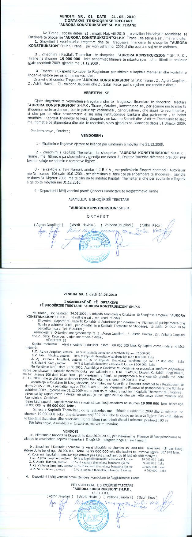 → Ekstrakti Historik i Regjistrit Tregtar date 11.05.2022 → Akt themelimi i Shoqerise → Kontrate shitblerje kuotash 06.09.2004 → Vendim i asamblese se ortakeve per zmadhimin e kapitalit 21.05.2010 → Ekstrakti Historik i Regjistrit Tregtar date 02.05.2023 → Ekstrakt Historik i Regjistrit Tregtar date 11.08.2023 → Ekstrakti Historik i Regjistrit Tregtar date 22.04.2024 |