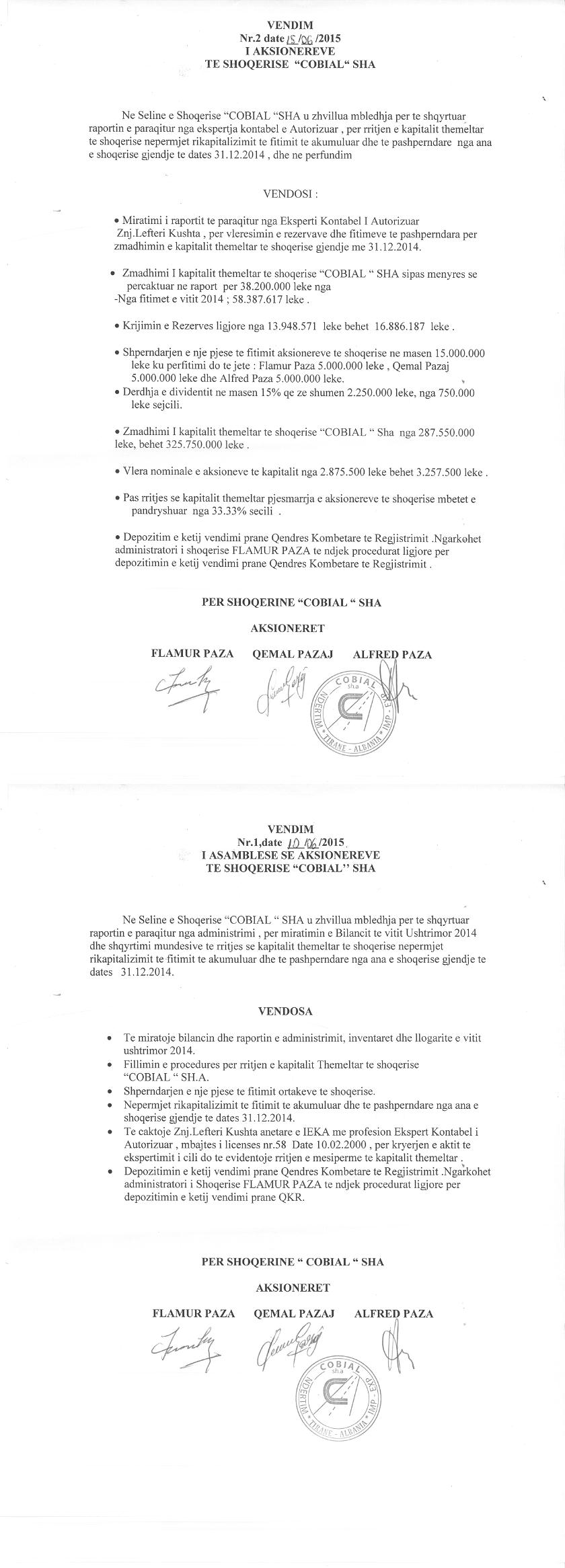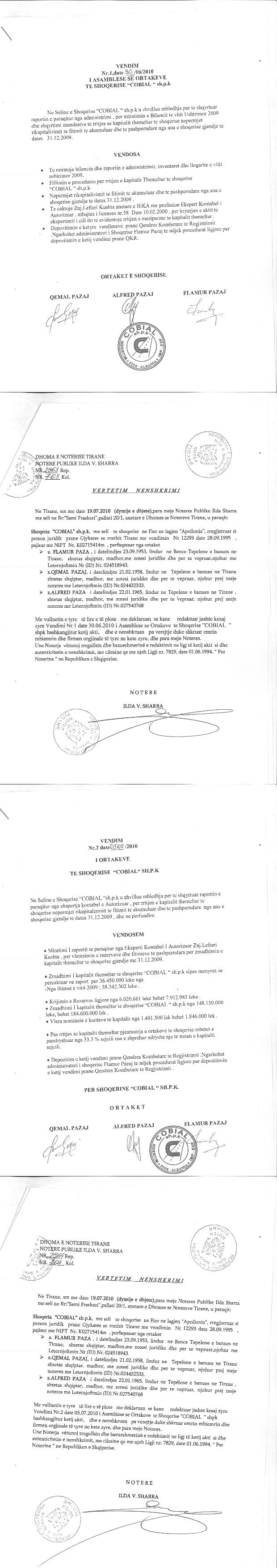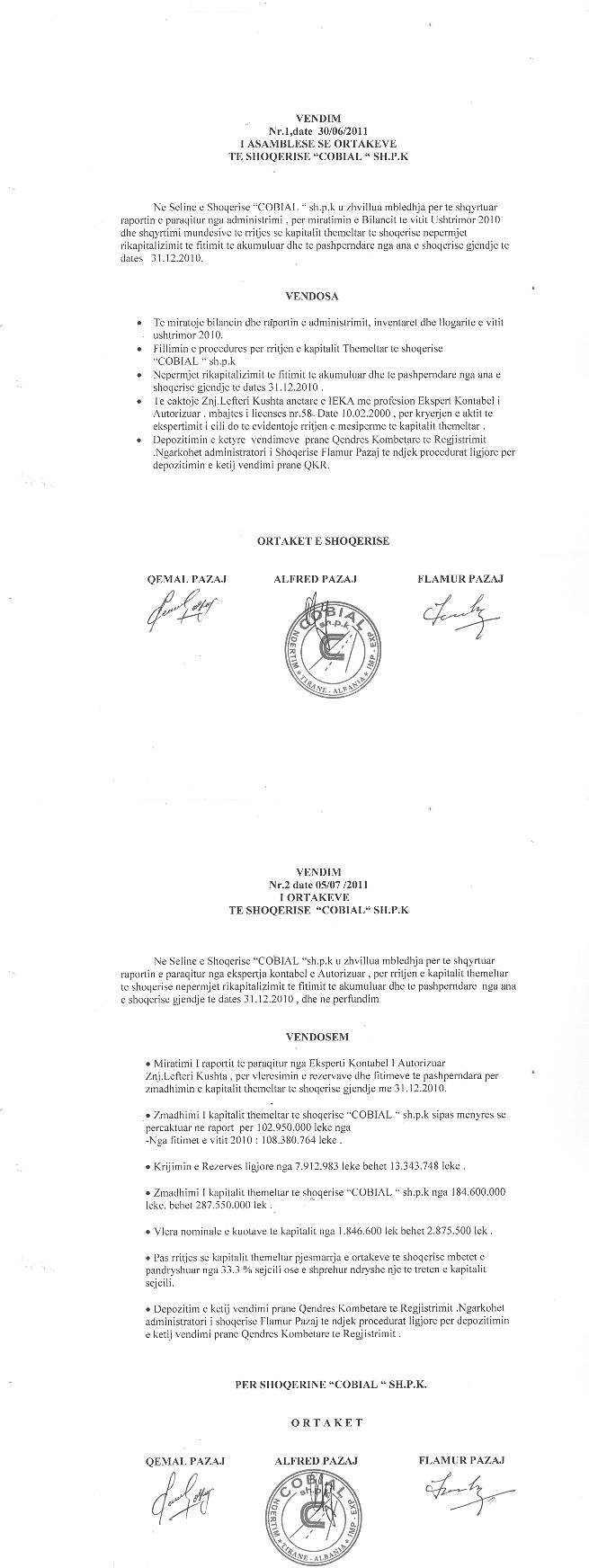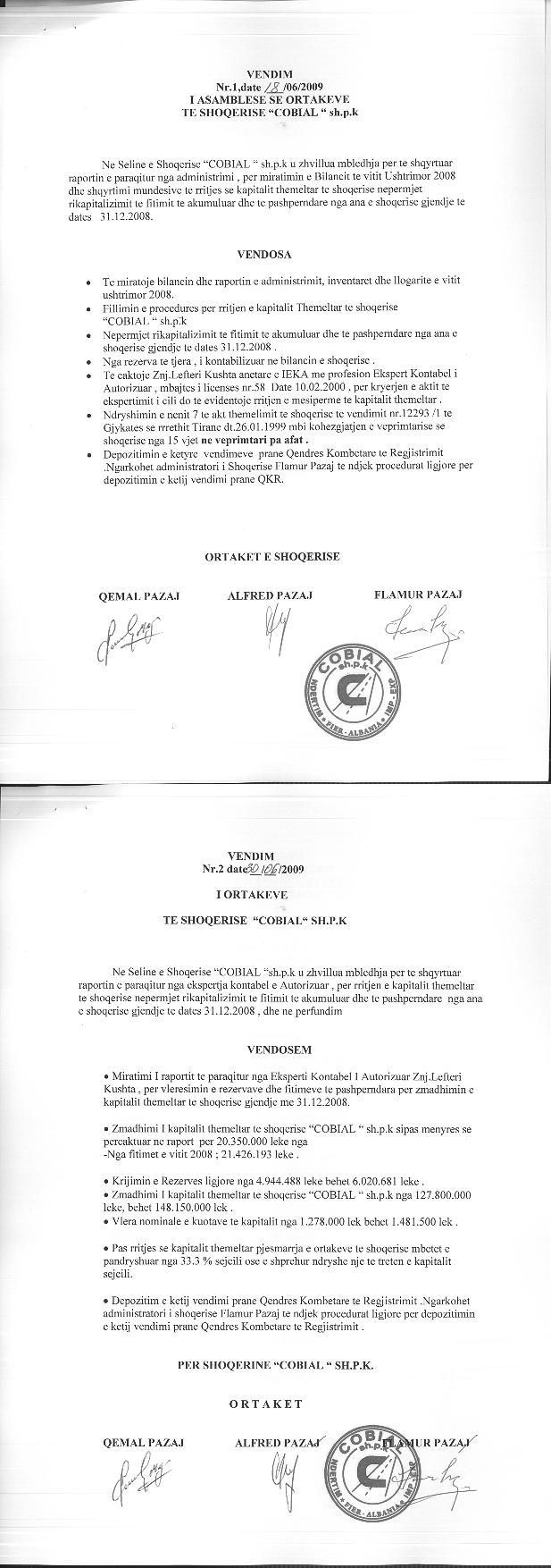 → Ekstrakt historik i regjistrit tregtar 03.06.2022 → Akti i themelimit dhe statuti i shoqerise → Kontrate shitje kuotash 17.12.1998 → Raporti per zmadhimin e kapitalit 25.07.2008 → Vendimi per zmadhimin e kapitalit 24.06.2017 → Vendimi I asamblese se ortakeve per zmadhimin e kapitalit 24.06.2017 → Vendimi per zmadhimin e kapitalit 18.06.2009 → Vendimi I asamblese per rritjen e kapitalit 30.06.2010 → Vendimi per zmadhimin e kapitalit 30.06.2011 → Vendimi I aksionereve per zmadhimin e kapitalit 15.06.2015 → Vendimi I asamblese per shnderrimin ne shoqeri anonime 27.02.2013 → Vendimi I asamblese per shnderrimin ne sh.p.k 15.04.2016 → Kontrate Dhurimi Kuotash date 22.12.2021 → Ekstrakti Historik i Regjistrit Tregtar date 19.01.2023 → Ekstrakt Historik i Regjistrit Tregtar date 04.12.2024 |