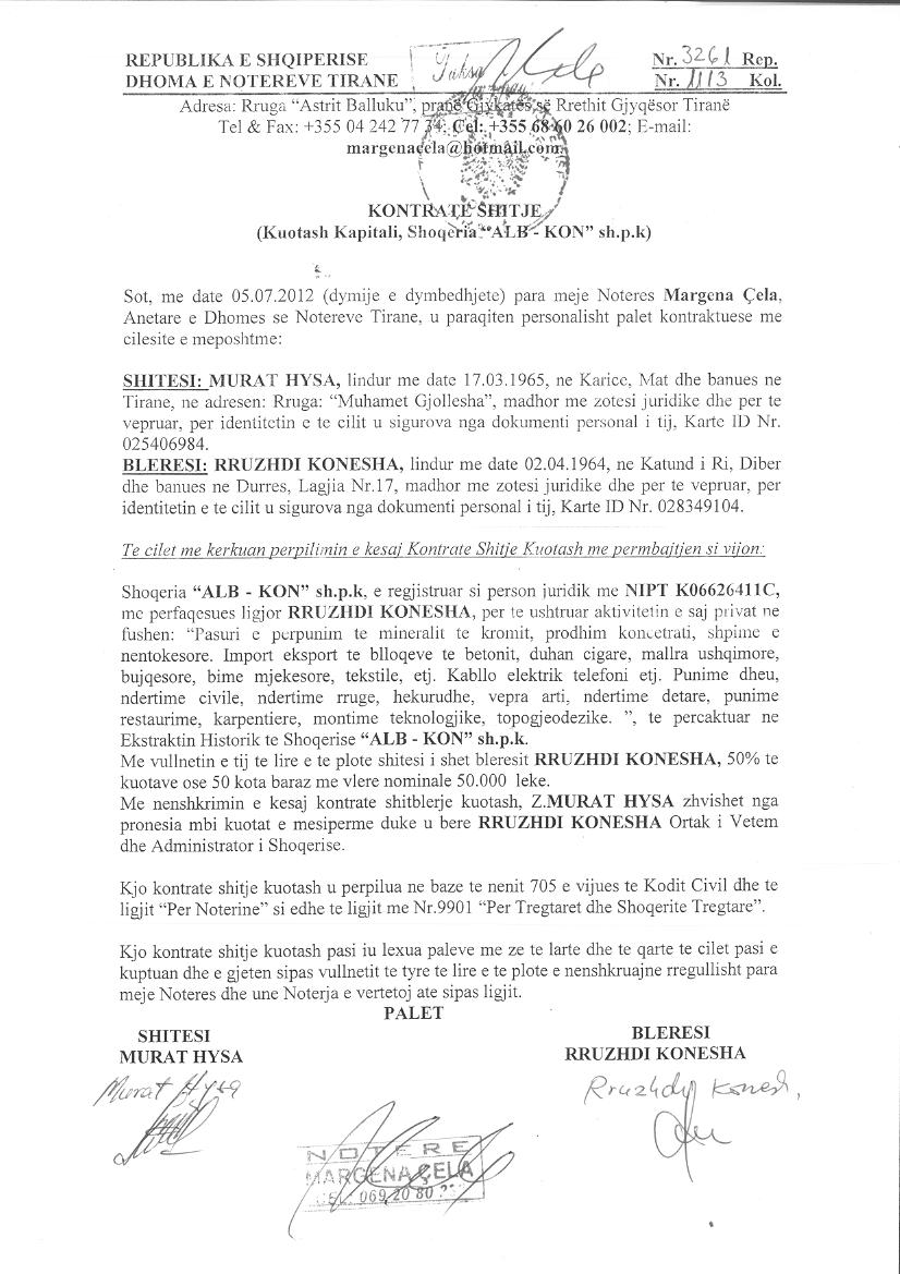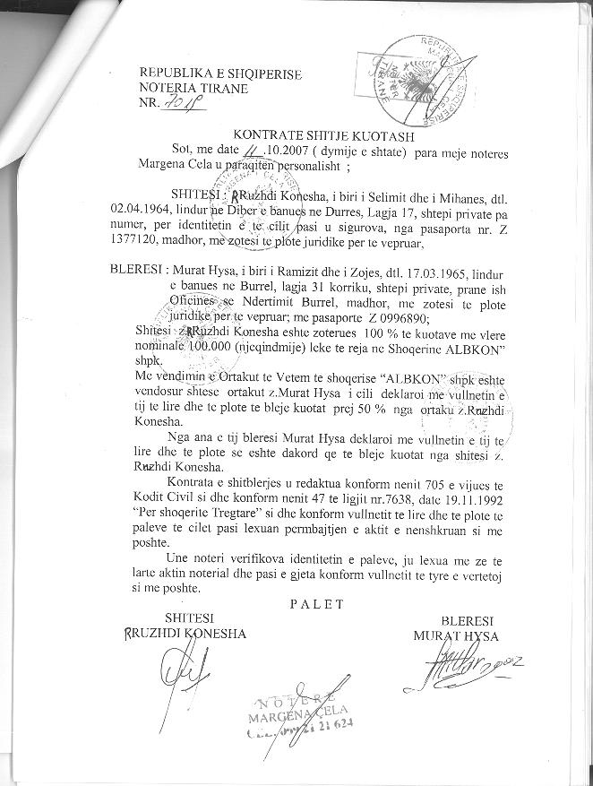 → Ekstrakt historik i regjistrit tregtar 19.05.2022 → Akti i themelimit dhe statuti → Kontrate shitje kuotash kapitali 04.02.2013 → Kontrate shitje kuotash kapitali 05.07.2012 → Kontrate shitje kuotash 11.10.2007 → Ekstrakti Historik i Regjistrit Tregtar date 18.04.2024 |