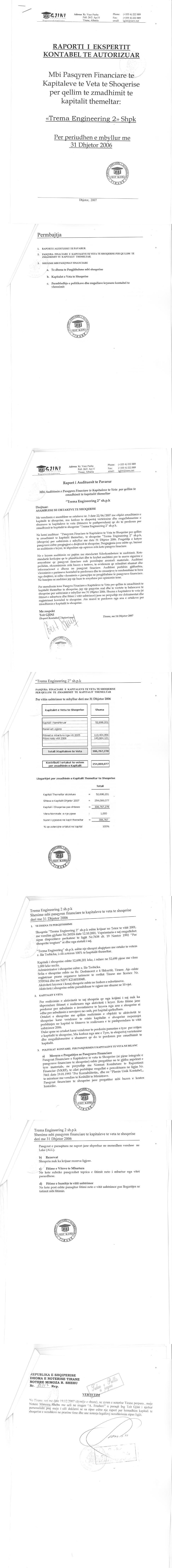 | Parent Company / Owner: | STRATBAG AG, një shoqëri aksionare e inkorporuar dhe ekzistuese sipas legjislacionit të Republikës së Austrisë, e regjistruar në regjistrin tregtar Klagenfurt më 10.01.1930, nën numrin FN 61689 W, me seli të regjistruar aktiviteti në OrtenburgerstraBe 27, 9800 Spittal/Drau, Austri, me kapital akisonar të barabartë me 12.000.000 (dymbëdhjetë milion) euro (Sipas vendimit të Bordit Drejtues të Stratbag AG, datë 20.11.2015, të dorëzuar në QKB) Sipas Ekstraktit Historik te Regjistrit te Pronarit Perfitues, date 31.05.2021, terhequr nga QKB ne daten 30.03.2022, Pronar perfitues i shoqerise eshte: Oleg Deripaska, shtetas rus, i datelindjes 1968, pronar perfitues pasi zoteron 25.9% te kapitalit te STRABAG AG- ortak i vetem i shoqerise TREMA ENGINEERING 2. Data e percaktimit si pronar perfitues: 17.08.2007. Sipas Ekstraktit Historik te Regjistrit te Pronarit Perfitues, date 01.07.2022, terhequr nga QKB date 25.01.2023, Pronaret perfitues te subjektit TREMA ENGINEERING 2 zoterues te 25% te kapitalit e me teper, jane : Hans Peter Haselsteiner , shtetas austriak, i datelindjes 1944, pronar perfitues per 28.34% te kapitalit te Strabag AG- ortak i vetem i shoqerise TREMA ENGINEERING 2. Data e percaktimit si pronar perfitues eshte 17.08.2007. Klemens Peter Haselsteiner , shtetas austriak, i datelindjes 1980, pronar perfitues per 28.34% te kapitalit te Strabag AG- ortak i vetem i shoqerise TREMA ENGINEERING 2. Data e percaktimit si pronar perfitues eshte 17.08.2007. |