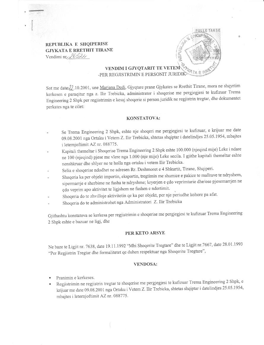 | Legal Form: | Shoqëri me Përgjegjësi të Kufizuar SH.P.K |