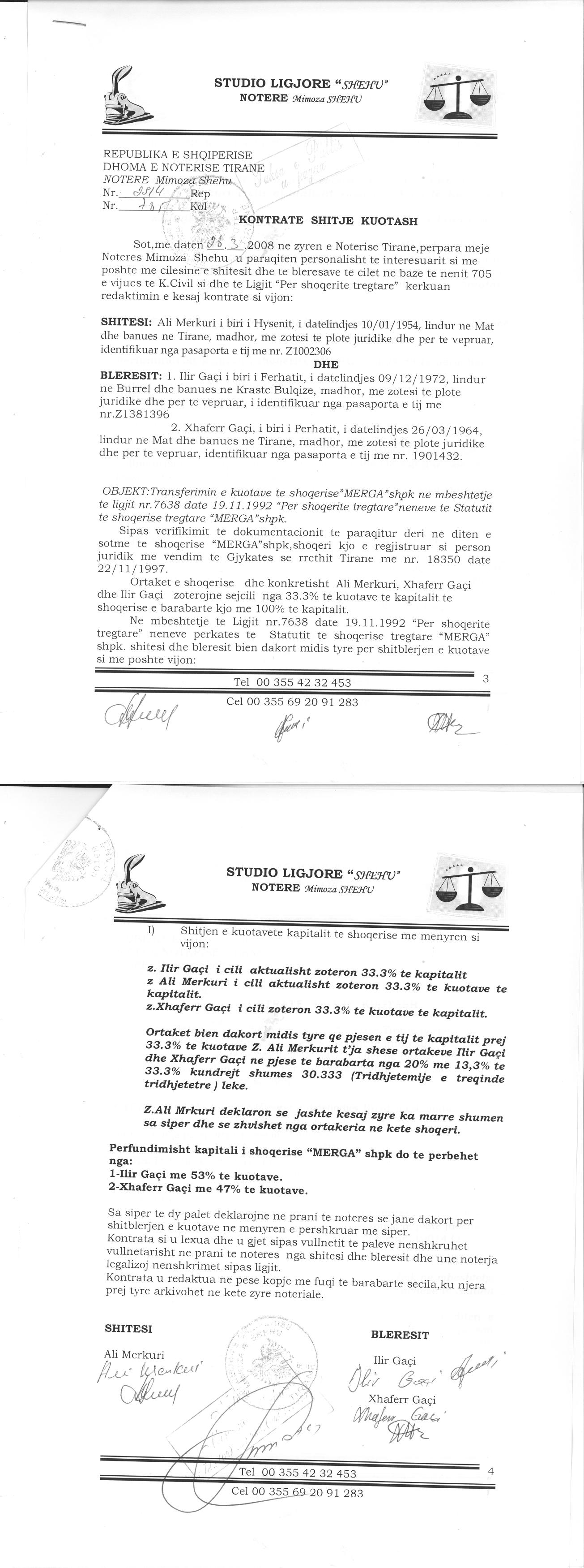→ Ekstrakt historik i regjistrit tregtar date 03.05.2022 → Akti i themelimit dhe statuti → Kontrate shitje kuotash te kapitalit themeltar date 20.01.2006 → Kontrate shitje kuotash date 28.03.2008 → Urdher per venien e sekuestros konservative, date 04.03.2019 → Ekstrakti Historik i Regjistrit Tregtar date 16.05.2024 → Urdher per venien e sekuestros konservative date 16.09.2022 → Urdher per venien e sekuestros konservative date 30.11.2023 |
