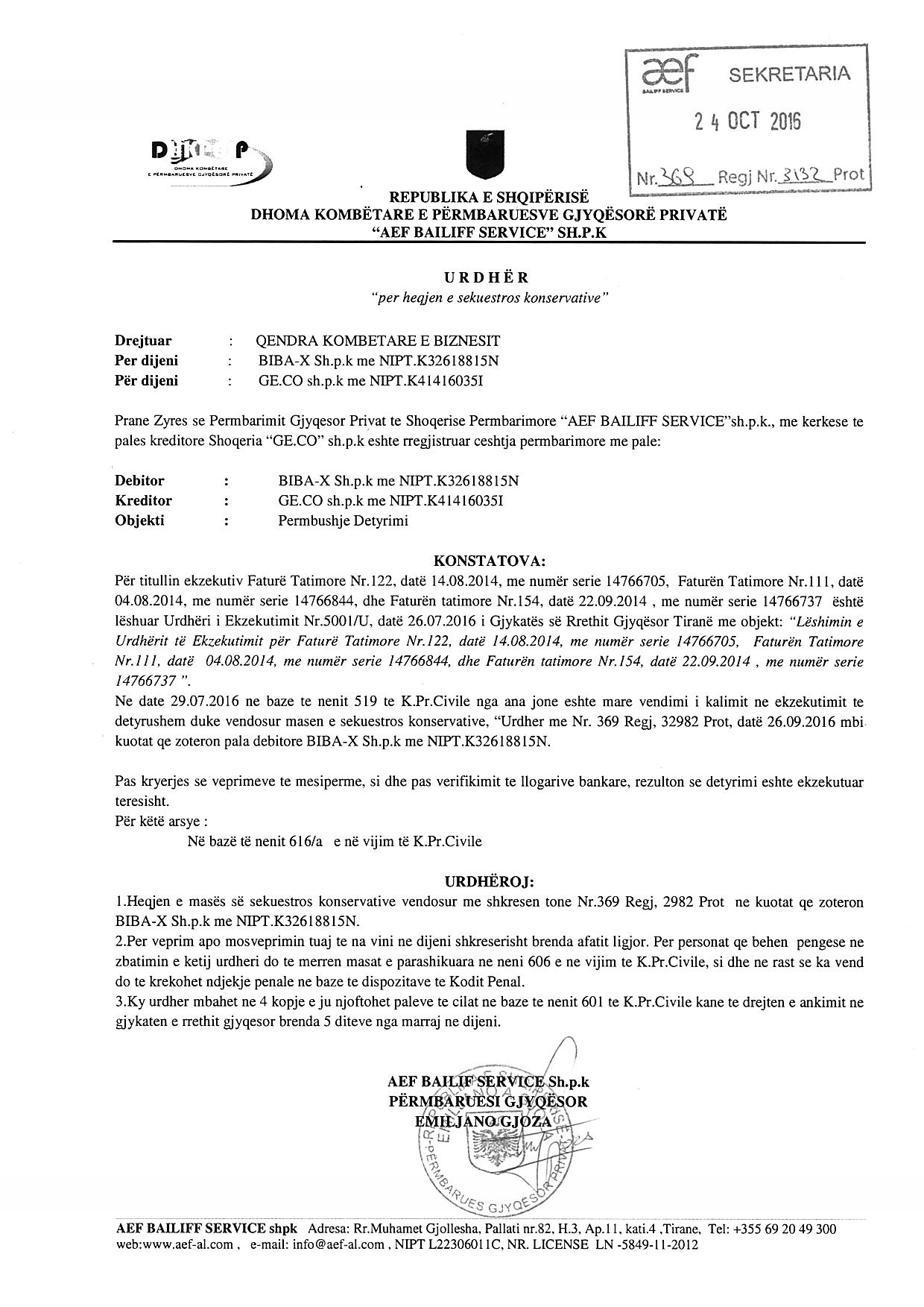 | Legal Cases: | I. Më datë 26.11.2013, me anë të urdhërit Nr.512 Regj, Nr.512/4 Prot, lëshuar nga shoqëria përmbarimore “JUS”, u vendos e sekuestro mbi kuotat dhe të drejtat që rrjedhin nga zotërimi i kuotave të debitorit “BIBA-X” shpk, për shumën e detyrimit prej 270.500 lekë përfshirë dhe tarifën e plotë përmbarimore, ndaj kreditorit Drejtoria e Shërbimit Pyjor Kavajë. II. Më datë 05.12.2013, me anë të urdhërit Nr.512 Regj, Nr.512/5 Prot, lëshuar nga shoqëria përmbarimore "JUS", u vendos heqja e sekuestros mbi kuotat dhe të drejtat që rrjedhin nga zotërimi i kuotave. III. Më datë 26.09.2016, me anë të urdhërit Nr. 2982 Prot., Nr. 369 Regj., lëshuar nga Shoqëria Përmbarimore “AEF Bailiff Service” sh.p.k, u vendos masa e sekuestros konservative mbi kuotat që zotëron debitori BIBA-X sh.p.k me qëllim mostjetërsimin dhe /ose disponimin e tyre si dhe moskryerjen e asnjë veprimi tjetër i cili mund të ndryshojë të dhënat e regjistrit tregtar, me qëllim përmbushjen e detyrimeve ndaj kreditorit GE.CO sh.p.k. IV. Më datë 24.10.2016, me anë të urdhërit Nr.369 Regj., Nr.3132 Prot., lëshuar nga Shoqëria Përmbarimore “AEF BAILIFF SERVICE” sh.p.k, është vendosur heqja e masës së sekuestros konservative vendosur me shkresën Nr.369 Regj., Nr.2982 Prot, në kuotat që zotëron shoqëria “BIBA-X” sh.p.k. V. Më datë 24.10.2016, me anë të urdhërit Nr. 369 Prot, lëshuar nga Shoqëria Përmbarimore "AEF BAILIFF SERVICE", u vendos heqja e masës së sekuestros konservative vendosur me shkresën Nr. 369 Regj., Nr. 2982 Prot., në kuotat që zotëron BIBA-X Shpk, pas përmbushjes së detyrimit ndaj shoqërisë GE.CO shpk. VI. Më datë 16.05.2017, me anë të urdhërit Nr. 3342 Prot. lëshuar nga shoqëria përmbarimore E.P.S.A Shpk, u vendos bllokimi i kuotave dhe të drejtave që rrjedhin nga zotërimi i kuotave për subjektin BIBA-X Shpk deri në një urdhër të dytë nga përmbaruesi gjyqësor. Ky urdhër u ndërmor pas kërkesës së kreditorit “S.I.A.C” shpk në lidhje me detyrimet e papaguara të shoqërisë BIBA-X shpk ndaj tij. VII. Më datë 17.10.2017, me anë të urdhërit Nr.5075/3 Prot, lëshuar nga shoqëria përmbarimore Justitia, u vendos heqja e masës së sekuestros konservative në aktivet e palës debitore, shoqërisë BIBA-X sh.p.k, meqënëse detyrimi ndaj Agjencisë Kombëtare të Burimeve Natyrore është shyer plotësisht. VIII. Më datë 02.07.2018, me anë të urdhërit Nr. 050/11 Prot, lëshuar nga përmbaruesi gjyqësor Eduard Allmani, u vendos sekuestro konservative mbi kuotat për subjektin BIBA-X Shpk, duke bllokuar tjetërsimin e kuotave deri në një urdhër të dytë nga përmbaruesi gjyqësor, me objekt përmbushje detyrimi në lekë ndaj kreditorit “S.I.A.C” shpk. IX. Më datë 23.07.2018, me anë të urdhërit Nr. 050/18 Prot, lëshuar nga përmbaruesi gjyqësor privat Eduard Allamani, u vendos heqja e masës së sekuestros konservative mbi kuotat e shoqërisë BIBA-X Shpk, e vendosur me urdhrin Nr. 050/11 Prot, datë 02.07.2018. Shoqërisë BIBA-X shpk ka përmbushur detyrimet ndaj shoqërisë “S.I.A.C” shpk. X. Më datë 23.10.2018, me anë të urdhërit Nr. 87 Dosje, Nr. 5742 Prot, lëshuar nga Shoqëria Përmbarimore EPSA, është vendosur heqja e bllokimit të kuotave dhe e të drejtave që rrjedhin nga zotërimi i kuotave për debitorin, shoqërinë "Biba X" shpk, të kërkuar me shkresën Nr. 3342 Prot, datë 16.05.2017. XI. Më datë 14.11.2018, me anë të urdhërit Nr. 1249 Prot. Nr. 1180 Dosje, lëshuar nga Përmbaruesi Gjyqësor Privat "Altin Vako", është vendosur masa e sekuestros konservative mbi të gjitha kuotat e zotëruara nga “BIBA-X ” shpk, me objekt pagesën e gjobës ndaj Inspektoriatit Kombëtar të Mbrojtes së Territorit. XII. Më datë 19.11.2018, me anë të urdhërit Nr.1288 Prot. Nr.1180 Dosje, lëshuar nga Përmbaruesi Gjyqësor Privat "Altin Vako", u vendos pezullimi i ekzekutimit të urdhërit ekzekutimit Nr. 596 Regj. Them., dt. 26.04.2018, të Gjykatës Administrative të Shkallës së Parë Tiranë, për shoqërinë “BIBA-X ” shpk XIII. Me date 14.02.2019, me ane te vendimit Nr. 329 Prot, leshuar nga permbaruesi gjyqesor Altin Vako, u zhbllokuan aksionet e shoqerise BIBA-X Shpk me NUIS (NIPT) K32618815N dhe z. Barush Biba ne cilesine e administratorit te shoqerise, te bllokuara me ane te shkreses Nr. 1249 Prot., date 14.11.2018 te permbaruesit gjyqesor Altin Vako. XIV. Me date 15.10.2019, me ane te Urdhrit Nr.8106 Prot, protokolluar nga QKB me Nr.13169 Prot, date 17.10.2019, lëshuar nga Permbaures Privat 33 Ermir Godaj, u urdherua vendosja e masës së sekuestros konservative mbi kapitalin “Biba-X ” shpk, me NIPT K32618815N ne menyre qe te mos kryhet asnje veprim tjetersimi apo disponimi. XV. Me date 14.02.2020, me ane te Urdhrit Nr. 31/1 Prot., Nr.304 Dosje, protokolluar nga QKB me Nr.2278 Prot, datë 17.02.2020, lëshuar nga përmbaruesi gjyqësor privat “Bislim Sinaj”, u urdherua vendosja e sekuestros konservative mbi të gjitha aksionet/kuotat e debitorit shoqëria “BIBA-X” sh.p.k., me Nuis (Nipt)- K32618815N. XVI. Me date 18.02.2020, me vendim gjykate Nr. 38/5 Prot Nr. 304 Dosje, leshuar nga permbaruesi gjyqesor Bislim Sinaj, u vendos pezullimi i urdhrit te ekzekutimit Nr. 118 Akti datë 16.01.2020 të Gjykatës së Rrethit Gjyqësor Tiranë në ngarkim të debitorit Shoqëria Tregare “ BIBA-X” i regjistruar ne QKB me NIPT K32618815N me administrator z. Barush Biba, deri në përfundim te gjykimit te kerkese padise. XVII. Me date 08.01.2021, me ane te urdhrit Nr.665/4 Prot, protokolluar nga QKB, me Nr.247 prot., datë 11.01.2021 dhe Urdhrit Nr.664/4 Prot, protokolluar nga QKB, me Nr.248 prot., datë 11.01.2021 lëshuar nga Studio Përmbarimore L.D.C, u urdherua vendosja e masës së sekuestros konservative mbi aktivet e pales debitore, shoqëria “BIBA-X” SHPK, pajisur me NUIS (NIPT) - K32618815N. Sek