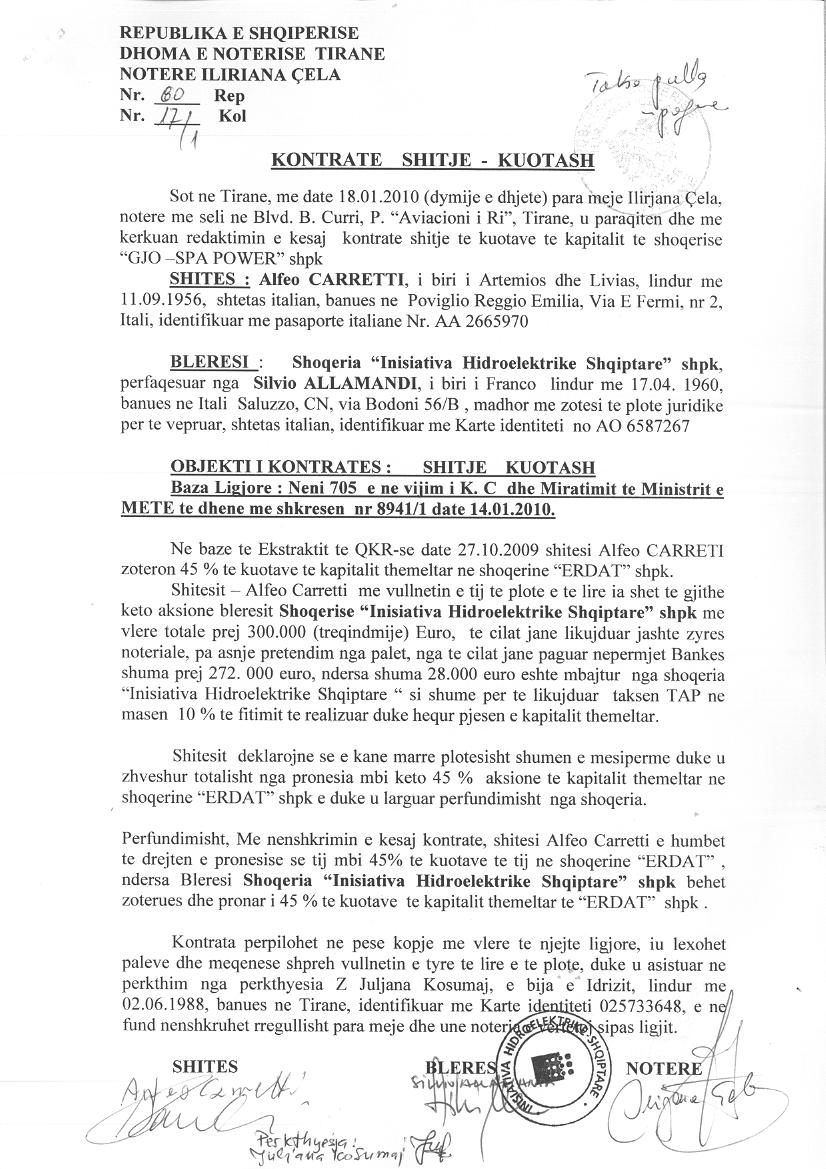 | Scope: | Financimi,projektimi,ndertimi,venia ne pune,administrimi,mirembajtja e hidrocentralit dhe trasferimi i tij tek Autoriteti Kontraktues. Me qellim te realizimit te aktivitetit te saj shoqeria mund te kryeje operacione tregtare me pasuri te luajtshme dhe te paluajtshem si dhe te administroje , te bleje, te shese, te jape me qira si dhe te kete interesa e pjesemarrje ne shoqeri, konsorciume te themeluara apo ne themelim e siper qe kane objekt te ngjashem me objektin e aktivitetit te shoqerise ose qe i sherbejne realizimit te objektit. |