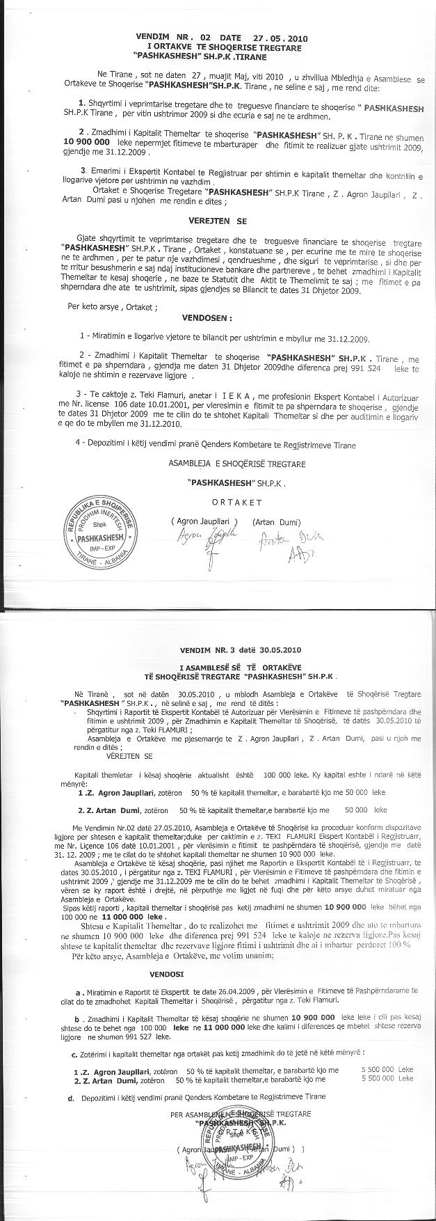 → Ekstrakti Historik i Regjistrit Tregtar date 19.05.2022 → Akt themelimi dhe Statuti i Shoqerise → Vendimi i asamblese per Zmadhim Kapitali date 30.05.2010 → Raport per Zmadhimin e Kapitalit date 12.07.2012 → Kontrate e Dhurimit te Kuotave date 27.02.2020 → Kontrate e Dhurimit te Kuotave date 19.08.2020 → Kontrate e Dhurimit te Kuotave date 10.02.2021 → Të dhëna në Regjistrin e Pronarëve Përfitues RPP, date 03.03.2022 → Raport per Zmadhimin e Kapitalit date 22.07.2013 → Ekstrakti Historik i Regjistrit Tregtar date 22.04.2024 → Urdher per heqjen e sekuestros konservative date 24.06.2022 → Urdher per vendosjen e sekuestros konservative date 13.02.2023 → Urdher per vendosjen e sekuestros konservative date 20.06.2023 → Kerkese per vendosjen e mases se sigurimit te detyrimit tatimor date 18.07.2023 → Urdher per vendosjen e mases se sekuestros konservative date 21.03.2024 → Kontrate e Dhurimit te Kuotave te Kapitalit date 01.06.2023 |