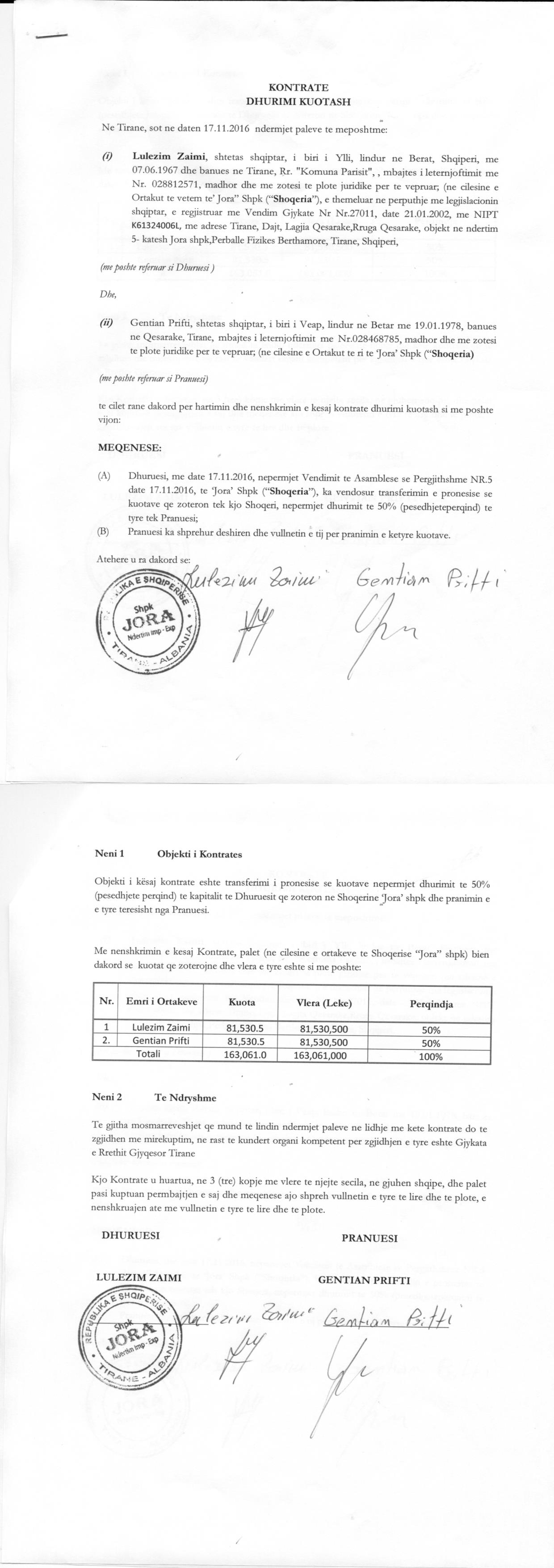 → Ekstrakti Historik i Regjistrit Tregtar date 18.05.2022 → Akt themelimi dhe Statuti i Shoqerise → Kontrate e Shitjes se Kuotave date 08.11.2005 → Kontrate e Shitjes se Kuotave date 07.01.2009 → Statuti i Shoqerise i Ndryshuar date 22.11.2012 → Raport per Konfirmimin e Zmadhimit te Kapitalit date 15.11.2012 → Kontrate e Dhurimit te Kuotave date 17.11.2016 → Urdher per Venine e Sekuestros date 06.01.2022 → Ekstrakti Historik i Regjistrit Tregtar date 12.04.2024 → Urdher per heqjen e sekuestros mbi pasurine e debitorit date 30.08.2022 → Kontrate e dhurimit te kuotave date 17.11.2022 |