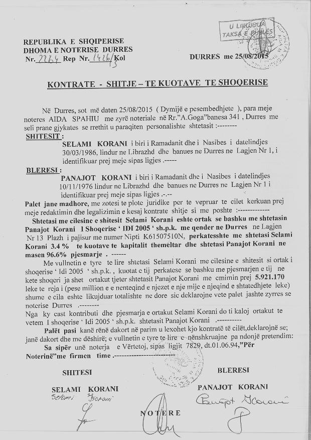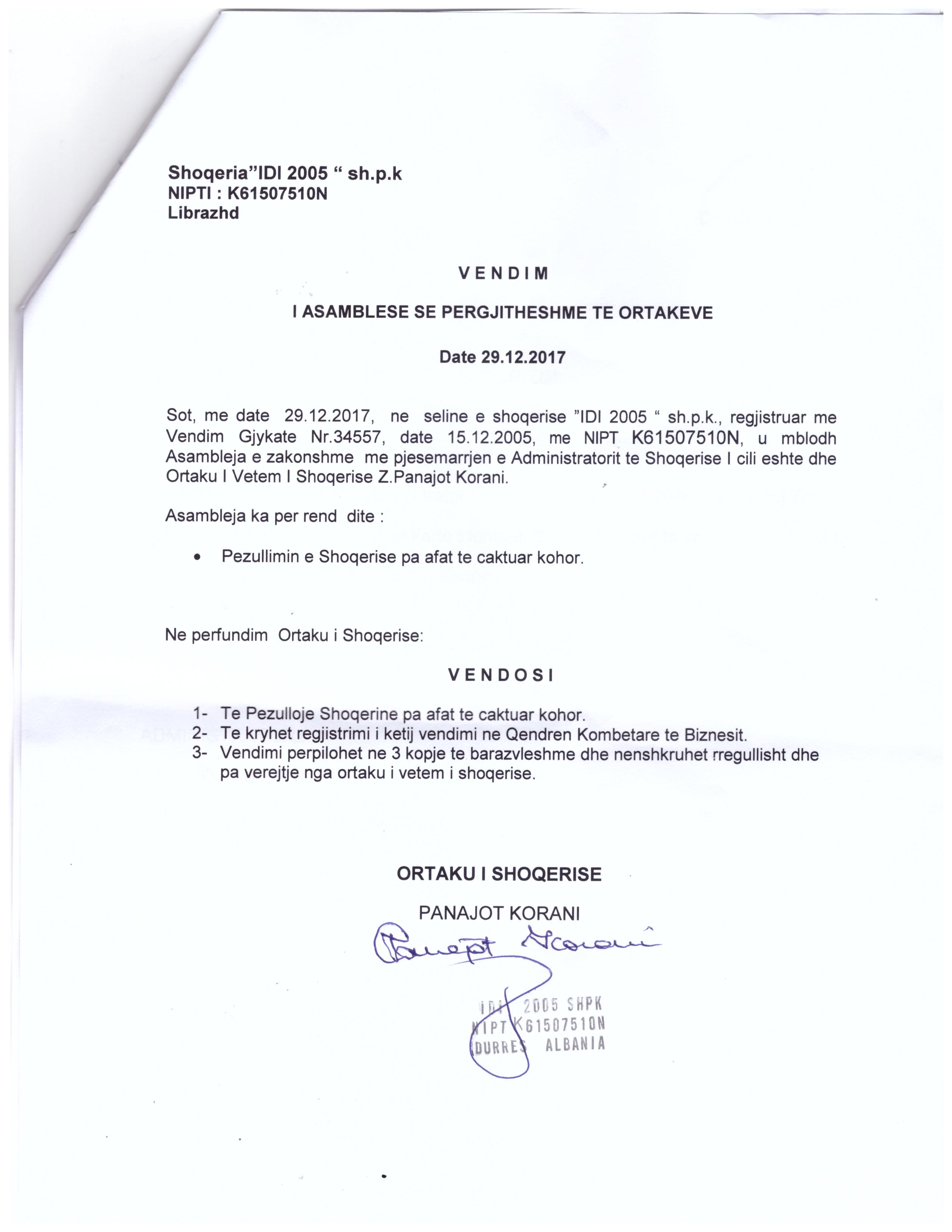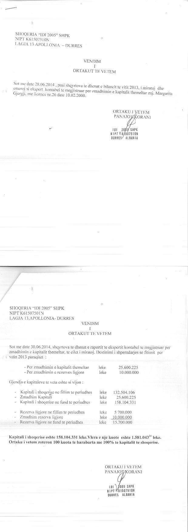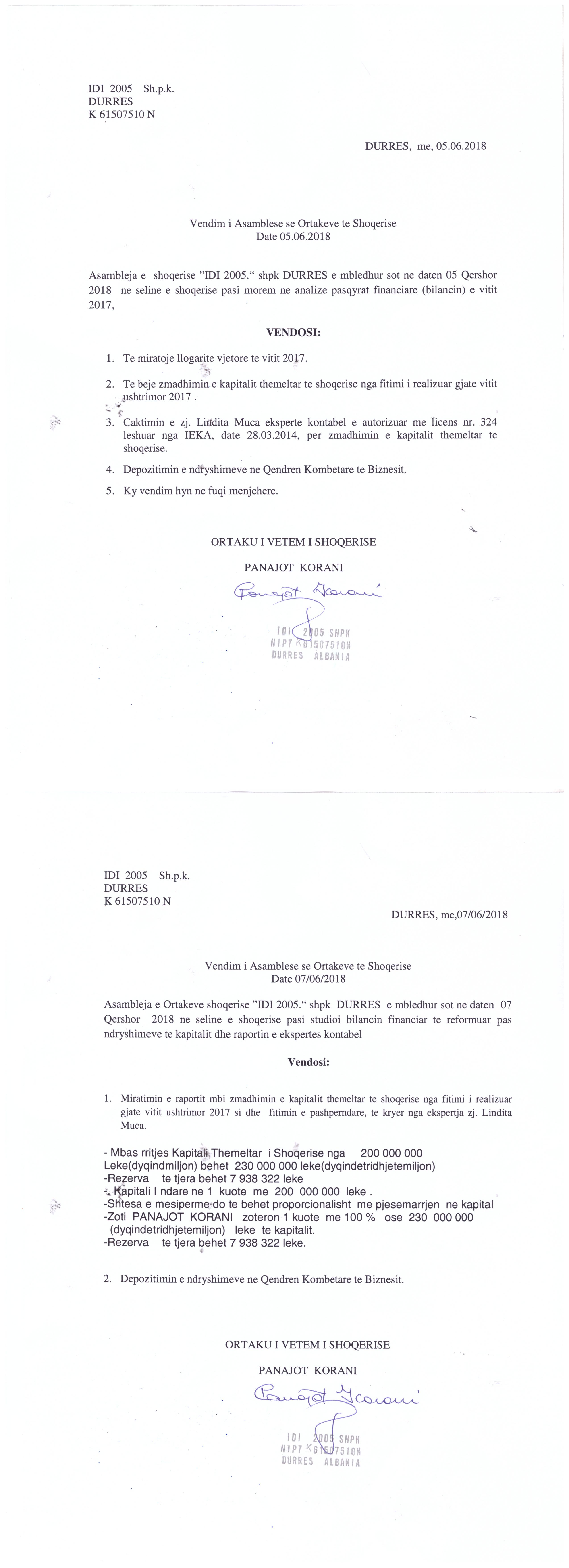 | Legal Cases: | I. Me date 24.06.2015, u nenshkrua marreveshja e bashkimit ndermjet shoqerise perthithese “IDI 2005” sh.p.k dhe shoqerise “Korani” sh.p.k. Shoqeria e perthithur “Korani” sh.p.k do te transferoje teresine e aktiveve dhe detyrimeve ne shoqerine perthithese “IDI 2005” shpk. Shoqeria “IDI 2005” shpk do te rezultoje me nje zmadhim te kapitalit me vleren e kapitalit dhe fitimin respektiv te dy shoqerive per vitin 2014, pra me 171.704.537 (njeqind e shtatedhjete e nje milion e shtateqind e kater mije e peseqind e tridhjete e shtate) leke. Ortaku i shoqerise “Korani”, Z. Selami Korani behet ortak ne shoqerine perthithese “Idi 2005”, bashke me Z. Panajot Korani. Panajot Korani do te zoteroje nje kuote prej 96.6% te kapitalit dhe Selami Korani do te zoteroje 3.4% te kapitalit. II. Me date 29.12.2017, me vendim te asamblese se ortakeve, u pezullua aktiviteti i shoqerise per nje afat te pacaktuar. Statusi i shoqerise ndryshon nga “Aktiv” ne “Pezulluar”. III. Me date 15.01.2018, me vendim te asamblese se ortakeve, u riaktivizua veprimtaria e shoqerise. Statusi ndryshoi nga “Pezulluar” ne “Aktiv”. IV. Me date 03.06.2019, u lidh marrëveshja siguruese Nr.1097 Rep., Nr.705/3 Kol, me palë: Raiffeisen Bank (Barrëmarrës/Kredidhënës dhe “IDI 2005”sh.p.k, “GAVRAN ENERGY” shpk.( Barrëdhënës / Kredimarrës), me objekt: Krijimi i barrës siguruese mbi kuotat e Z. Panajot Korani, në shoqerinë “IDI 2005”sh.p.k . V. Me date 05.10.2020, me vendim të ortakut të vetëm, u autorizua ofrimi i dorëzanisë financiare të shoqërisë Gavrani Energy shpk me NIPT l32012503R për marrjen e kredise nga ana e shoqërisë IDI 2005 shpk pranë bankës OTP Albania. Me date 05.10.2020, me vendim te ortakut të vetëm, u vendos miratimi i kërkesës për marrjen pranë bankës OTP Albania të kredisë. U miratua kerkesa për vendosjen e barrës hipotekore në favor të OTP Bank Albania mbi pasuritë e palujtshme të shoqërisë sipas listës së përcaktuar në vendim, për garantimin e kredisë. Shuma e kredise do te jete 125.000.000 (njeqind e njezet e pese milion) leke dhe afati i shlyerjes 5 vite. VI. Sipas Deklarates Noteriale nr. 3012 rep., nr. 1637 kol., date 27.11.2024 leshuar nga perfaqesuesit e BANKA OTP ALBANIA SHA, u deklarua se shoqeria “IDI 2005” SHPK lirohet nga cdo detyrim si barredhenes kundrejt bankes ne zbatim te Marreveshjes siguruese nr.2674 Rep., nr.1238 kol., dt. 09.10.2020. VII. Me date datë 25.9.2025 sipas vendimit Nr 534 te Keshillit te Ministrave, u mirauta ndertimi i centralit gjenerues te energjise fotovoltaike dhe veprave ndihmese, i cili nuk eshte objekt koncesioni, ne zonen kadastrale 3038, Fshati Povelce, njesia administrative Dermenas, Bashkia Fier, Qarku Fier, nga shoqeria "IDI 2005" shpk |