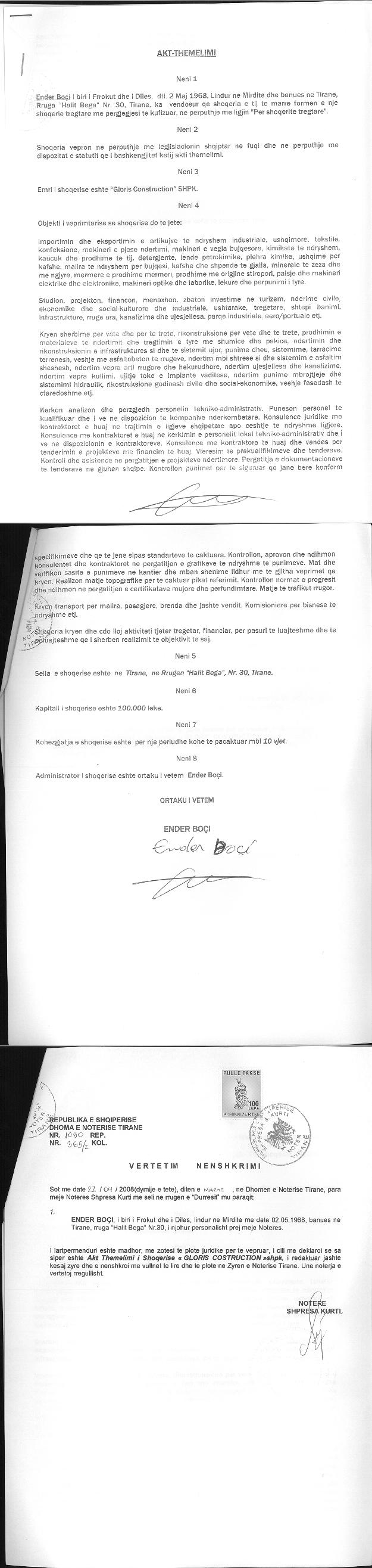 | Parent Company / Owner: | "MAK-08", shoqëri me përgjegjësi të kufizuar, e themeluar më datë 12/01/2008, sipas ligjeve të Republikës së Shqipërisë, me numër identifikimi në regjistrin tregtar NIPT K81313013K, me adresë aktuale në Tirane Rruga Sulejman Delvina, Hyrja nr 1, Apartamenti 17, Ndertesa nr 1834, prane Stadiumit Dinamo, dhe me administrator Kristian Boçi. Ortak i vetëm i shoqërisë është Kristian Boçi, zotërues për 100% të kapitalit. (Sipas të dhënave të QKB deri më datë 11.01.2025) Sipas Ekstraktit Historik te Regjistrit te Pronarit Perfitues, depozituar në QKB date 22.04.2022, terhequr datë 11.01.2025, Pronaret perfitues te subjektit “GLORIS CONSTRUCTION”, zoterues te 25% te kapitalit e me teper, janë: Kristian Boçi, shtetas shqiptar, i datelindjes 1977, pronar perfitues për 50% te pronësisë, pasi zotëron 100% të kapitalit të “MAK-08” shpk – shoqëri mëmë për 50% të kapitalit të “GLORIS CONSTRUCTION”. Data e percaktimit si pronar perfitues është 08.06.2018. Ender Boçi, shtetas shqiptar, i datelindjes 1968, pronar perfitues për 50% te pronësisë, në formë direkte. Data e percaktimit si pronar perfitues është 04.08.2021. |
