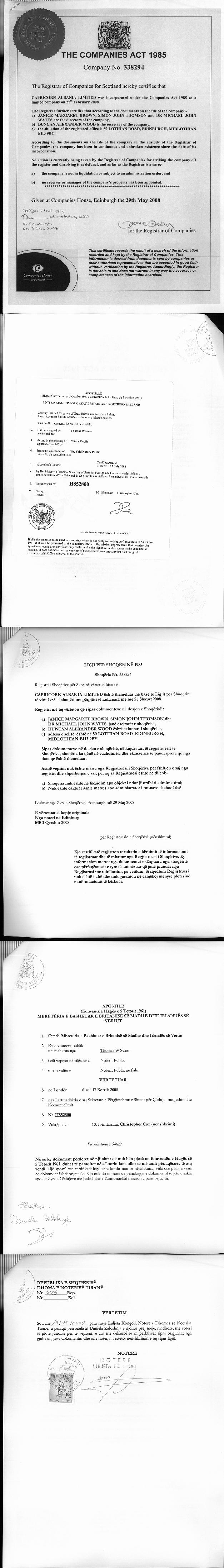 | Parent Company / Owner: | Orion Albania Limited (Ish Capricorn Albania Limited) është themeluar si shoqëri me përgjegjësi të kufizuar më 25.02.2008 dhe që funksionon sipas ligjeve të Mbretërisë së Bashkuar, me numër regjistrimi 338294, me adresë në 50 Lothan Road Edinburgh, Midlothian EH3 9BY, Skoci, me administratorë Janice Margaret Brown, Simon John Thomson dhe Michael John Watts (Sipas vërtetimit së regjistrit të shoqërive për Skocinë, datë 29.05.2008, të dorëzuar në QKB) Subjekti Juridik Orion Albania Limited Ltd nuk ka regjistruar të dhëna në regjistrin e pronarëve përfitues RPP |