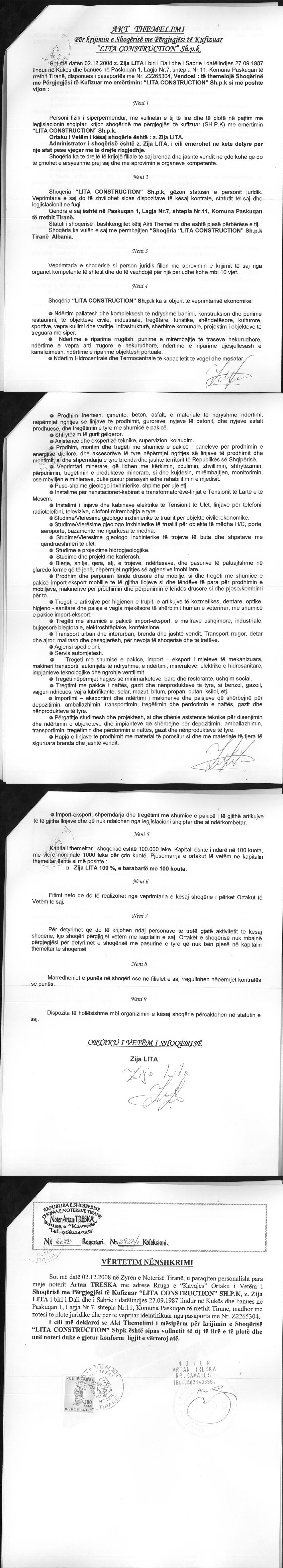 | Legal Cases: | I. Me date 09.10.2019, sipas Urdhrit Nr.9026 Prot., protokolluar nga QKB me Nr.12944 Prot., datë 11.10.2019, lëshuar nga Shoqëria Përmbarimore “E.G Bailiff Service”shpk u urdherua vendosja e masës së sekuestros konservative mbi të gjitha aksionet e zotëruara nga debitori “Lita Construction ”