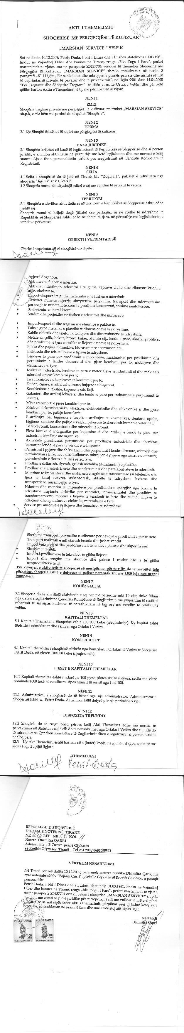 | Parent Company / Owner: | “EGI-K”, nje shoqeri me përgjegjësi të kufizuar, e themeluar me date 23/11/2001, sipas ligjeve te Republikes se Shqiperise, me numer identifikimi biznesi NIPT K77424401L, me adrese aktuale ne Diber Bulqize BULQIZE Lagjia e Re, Objekt privat me Nr. pasurie 2/143-ND, Kati i 2-te, Zona kadastrale Nr. 8611, dhe me administrator dhe ortak të vetëm Eduart Keta, zotërues për 100% të kapitalit të shoqërisë. (Sipas të dhënave të QKB deri më datë 27.03.2024) Sipas Ekstraktit Historik te Regjistrit te Pronarit Perfitues, depozituar në QKB date 08.01.2024, terhequr datë 27.03.2024, Pronaret perfitues te subjektit “MARSIAN SERVICE”, zoterues te 25% te kapitalit e me teper, është: Eduart Keta, shtetas shqiptar, i datelindjes 1968, pronar perfitues per 35% te pronesise, pasi zotëron 100% të kapitalit të “Egi-K” – shoqëri mëmë për 35% të kapitalit të “MARSIAN SERVICE”. Data e percaktimit si pronar perfitues është 31.01.2020. Edison Doda, shtetas shqiptar, i datelindjes 1990, pronar perfitues per 33% te pronesise. Data e percaktimit si pronar perfitues është 31.01.2020. Elton Doda, shtetas shqiptar, i datelindjes 1990, pronar perfitues per 32% te pronesise. Data e percaktimit si pronar perfitues është 23.11.2023. |