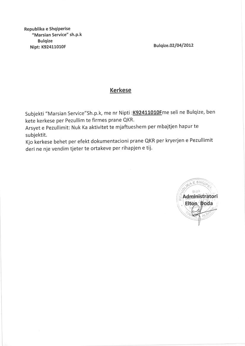 | Legal Cases: | I. Me date 02.04.2012, u pezullua aktiviteti i shoqerise per arsye se nuk ka aktivitet te mjaftueshem per mbajtjen hapur te subjektit. Statusi ndryshon nga: “Aktiv” ne “Pezulluar”. II. Me date 07.12.2012, u aktivizua veprimtaria e shoqerise. Statusi kthehet ne “Aktiv”. III. Me date 17.11.2021, me ane te shkreses Nr.1513/5Prot për Vendosjen e Mases se Sigurimit te detyrimit tatimor, lëshuar nga Drejtoria e Pergjithshme e Tatimeve, Drejtoria e Mbledhjes se Detyrimeve Tatimore te Papaguara, Rajoni Verior, Shkoder, u kerkua vendosja e Barres Siguruese mbi titujt e Pronesise ne menyre qe te mos kryhen veprime tjetersimi ndaj ketyre titujve per tatimpaguesin “MARSIAN SERVICE” pajisur me NUIS (NIPT)- K92411010F. IV. Me datë 16.06.2023, me anë të shkresës Nr. 522/5 Prot, për Vendosje të Masës së Sigurimit të Detyrimit Tatimor, lëshuar nga Drejtoria e Përgjithshme e Tatimeve, Rajoni Verior, u kërkua: Vendosja e masës së sigurimit të detyrimit tatimor, mbi tatimpaguesin shoqëria “ MARSIAN SERVICE” SH.P.K., pajisur me NUIS (Nipt)- K92411010F. Vendosja e kësaj masë synon të moslejohet tjetërsimi i titujve të pronësisë dhe të drejtat pasurore që i përkasin këtij tatimpaguesit deri në shlyerjen e detyrimeve tatimore. |