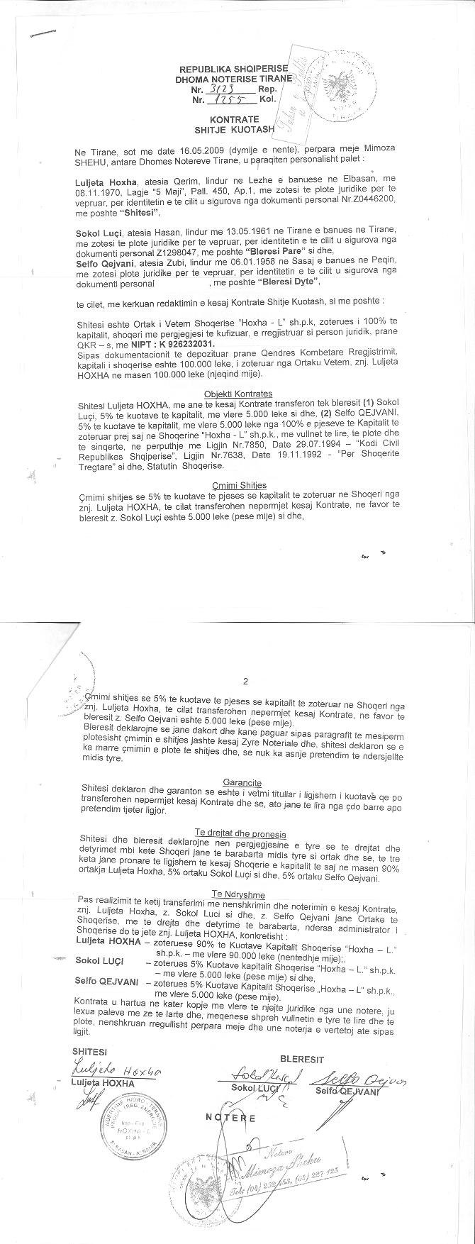 → Ekstrakti Historik i Regjistrit Tregtar date 12.05.2022 → Akt themelimi dhe Statuti i Shoqerise → Kontrate e Shitjes se Kuotave date 16.05.2009 → Ekstrakti Historik i Regjistrit Tregtar date 19.04.2024 |