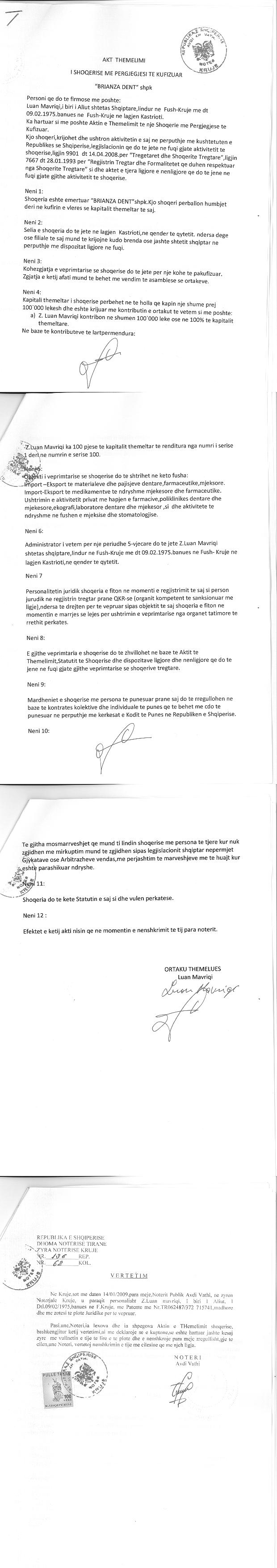 | Scope: | Import -Eksport te materialeve dhe pajisjeve dentare,farmaceutike,mjekesore. Import -Eksport te medikamenteve te ndryshme mjekesore dhe farmaceutike. Ushtrimin e aktivitetit privat me hapjen e farmacive, qendrave shendetesore, poliklinikes dentare,ekografi,laboratore dentare dhe mjekesore si dhe aktivitete te ndryshme ne fushen e mjekesise dhe stomatologjise. Te ofroje aktivitete te edukimit ne vazhdim per profesionistet e shendetesise. Shitje, blerje me shumice dhe pakice te pajisjeve dhe materialeve dentare dhe mjekesore.Veprimtari me burime te rrezatimeve jonizuese – gjeneratore me rreze X. |